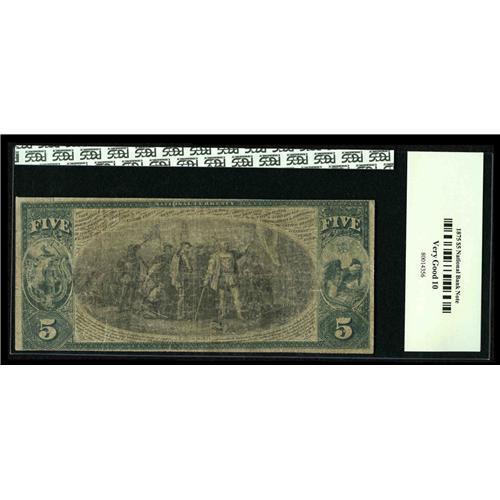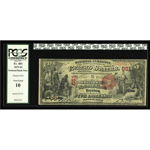 <B>Boston, MA</B></I> - $5 1875 Fr. 401 <B>The Broadway NB</B></I> Ch. # 551<BR>The face looks better than the back on this example with dark penned signatures and a nice red overprint. This note is not found in the census of 7 large which contains only Brown Backs and earlier notes. The Broadway exited the banking scene on December 16, 1899 due to incompetent management. <B>PCGS Very Good 10.</B></I>
