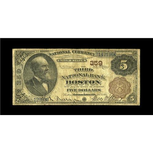 <B>Boston, MA</B></I> - $5 1882 Brown Back Fr. 466 <B>The Third NB</B></I> Ch. # 359<BR>This bank closed forever on Christmas Eve in 1901, leaving a census of 21 large survivors. This $5 Brown Back has seen its share of circulation and is a solid <B>Very Good,</B></I> with the ornate officers' signatures still dark and easily readable.<BR><BR><b>Shipping:</b> Coin/Currency (<a target="_blank" href="http://www.heritageauctions.com/common/shipping.php">view shipping information</a>)