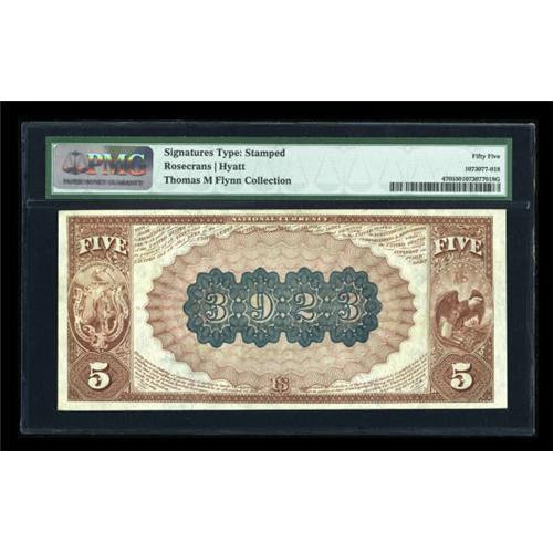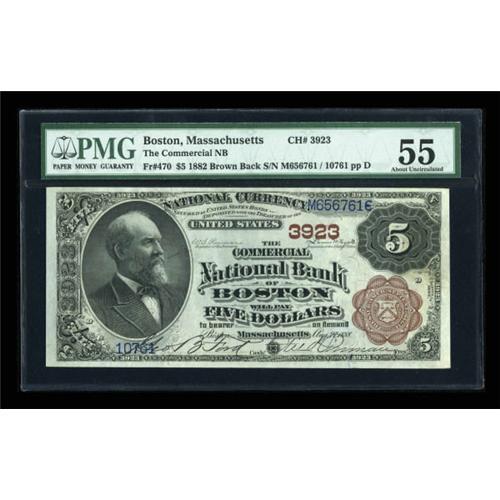 <B>Boston, MA</B></I> - $5 1882 Brown Back Fr. 470 <B>The Commercial NB</B></I> Ch. # 3923<BR> This is one of only two early notes known from this scarcer Boston bank, and by far the finer of the pair. It's a bright and attractive piece worthy of a place in any state or type collection. PMG <B>About Uncirculated 55,</B></I> with great color, signatures, and eye appeal. <BR><I>From The Thomas M. Flynn Collection</B></I><BR><BR><b>Shipping:</b> Coins & Currency (<a target="_blank" href="http://www.heritageauctions.com/common/shipping.php">view shipping information</a>)
