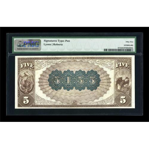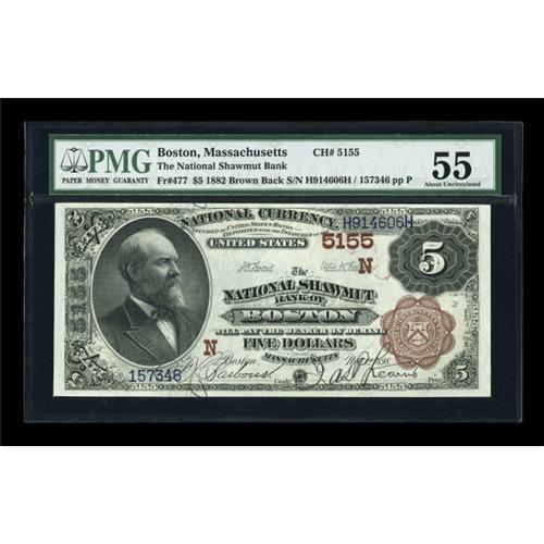 <B>Boston, MA</B></I> - $5 1882 Brown Back Fr. 477 <B>The National Shawmut Bank</B></I> Ch. # (N)5155<BR> One of the more common notes for this bank, but the layout features a narrow "Five Dollars" which is not at all common in the $5 Brown Back series. <B>PMG About Uncirculated 55.</B></I><BR><BR><b>Shipping:</b> Coins & Currency (<a target="_blank" href="http://www.heritageauctions.com/common/shipping.php">view shipping information</a>)