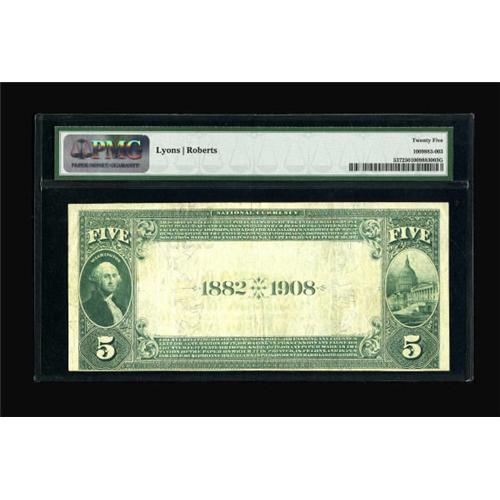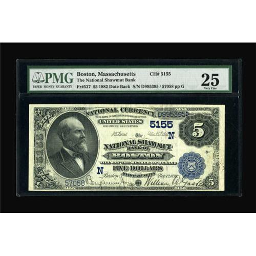 <B>Boston, MA</B></I> - $5 1882 Date Back Fr. 537 <B>The National Shawmut Bank</B></I> Ch. # (N)5155<BR> Some embossing can still be seen on this bright example graced with the printed signatures of Benjamin Joy and William A. Gaston. <B>PMG Very Fine 25.</B></I><BR><BR><b>Shipping:</b> Coins & Currency (<a target="_blank" href="http://www.heritageauctions.com/common/shipping.php">view shipping information</a>)