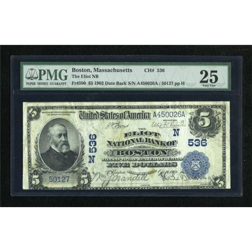 <B>Boston, MA</B></I> - $5 1902 Date Back Fr. 590 <B>The Eliot NB</B></I> Ch. # (N)536<BR> The stamped signatures of Wm. J. Mandell and H.L. Burrage are noted on this mid-grade issue. <B>PMG Very Fine 25.</B></I><BR><BR><b>Shipping:</b> Coins & Currency (<a target="_blank" href="http://www.heritageauctions.com/common/shipping.php">view shipping information</a>)