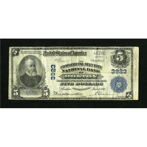 <B>Boston, MA</B></I> - $5 1902 Plain Back Fr. 600 <B>The Commercial Security NB</B></I> Ch. # 3923<BR>Here is a scarce Boston title that lasted less than six years. This note is crisp with solid margins and exhibits some light soiling on the back. <B>Very Fine.</B></I><BR><BR><b>Shipping:</b> Coins & Currency (<a target="_blank" href="http://www.heritageauctions.com/common/shipping.php">view shipping information</a>)