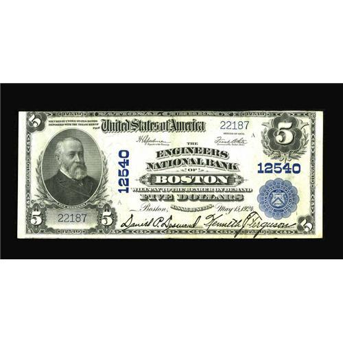 <B>Boston, MA</B></I> - $5 1902 Plain Back Fr. 609 <B>Engineers NB</B></I> Ch. # 12540<BR>The second title used by this union organized bank, one of several chartered by railway labor organizations during the 1920s. Most failed before the end of the decade due to inexperienced management, and the onset of the Depression served to kill off those few banks that remained. This is one of the nicer large examples we've encountered. <B>Extremely Fine,</B></I> with a tiny bit of writing in the reverse margin.<BR><BR><b>Shipping:</b> Coins & Currency (<a target="_blank" href="http://www.heritageauctions.com/common/shipping.php">view shipping information</a>)