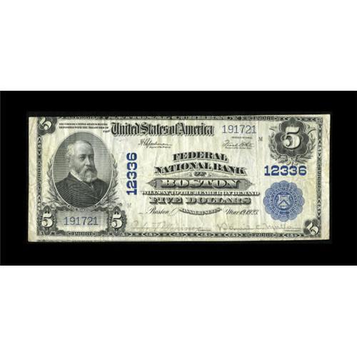 <B>Boston, MA</B></I> - $5 1902 Plain Back Fr. 609 <B>Federal NB</B></I> Ch. # 12336<BR> One of the always in demand "Forbidden Title" bank names. Tonight's offering is a bright <B>Very Fine</B></I> with considerable residual crispness and black stamped officers' signatures. Trimmed in slightly at the top margin.<BR><BR><b>Shipping:</b> Coins & Currency (<a target="_blank" href="http://www.heritageauctions.com/common/shipping.php">view shipping information</a>)