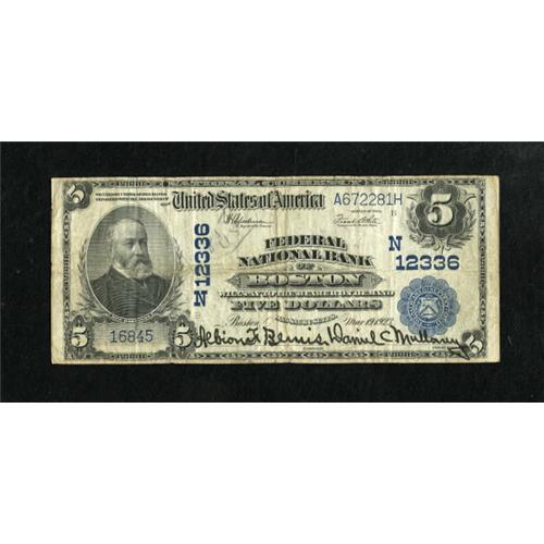 <B>Boston, MA</B></I> - $5 1902 Plain Back Fr. 609 <B>Federal NB</B></I> Ch. # (N)12336<BR> Dark stamped signatures cannot be missed on this example with a margin split and some pencil marks. <B>Very Good-Fine</B></I>.<BR><BR><b>Shipping:</b> Coins & Currency (<a target="_blank" href="http://www.heritageauctions.com/common/shipping.php">view shipping information</a>)