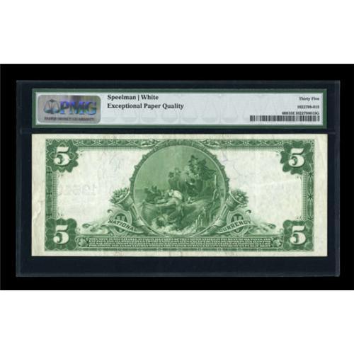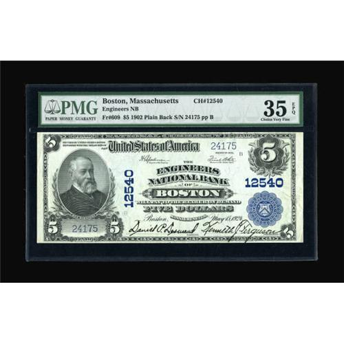 <B>Boston, MA</B></I> - $5 1902 Plain Back Fr. 609 <B>Engineers NB</B></I> Ch. # 12540<BR> This was the second title used by this labor affiliated bank, which started off life as one of the so-called "Brotherhood" banks organized by railway labor unions in the mid-1920's. Like most of its comrades, it failed to outlive the effects of the Depression, which killed this institution off in 1930. This piece has been graded as <B>Choice Very Fine 35 EPQ</B></I> by PMG, and displays bold black signatures to go with its Exceptional Paper Quality. <BR><BR><b>Shipping:</b> Coins & Currency (<a target="_blank" href="http://www.heritageauctions.com/common/shipping.php">view shipping information</a>)