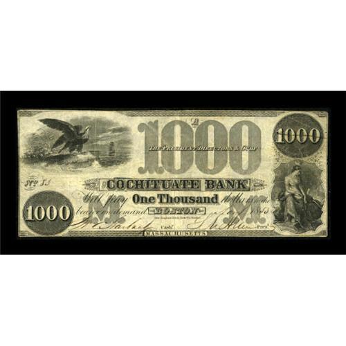 <B>Boston, MA- Cochituate Bank</B></I> $1000 Nov. 1, 1853 G20<BR> A superb and fully issued high denomination note. Issued high denomination examples are just plain rare from any location, as this represented an enormous sum of money in the 1850's. Only a few notes of this denomination were found in the famous "Cochituate Hoard" of 20,000 or so notes. Nice <B>Very Fine,</B></I> ex-Stack's Americana sale, January, 2001, lot 2280.<BR><I>From The Collection of a Louisiana Gentleman.</B></I><BR><BR><b>Shipping:</b> Coins & Currency (<a target="_blank" href="http://www.heritageauctions.com/common/shipping.php">view shipping information</a>)