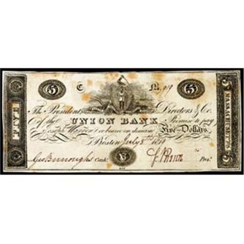 Haxby MA-385-C104b. A sharp looking counterfeit from plates copied from Reed. Massachusetts seal at the top center. Fully issued, signed and dated 1819. Some minor foxing, but quite attractive.