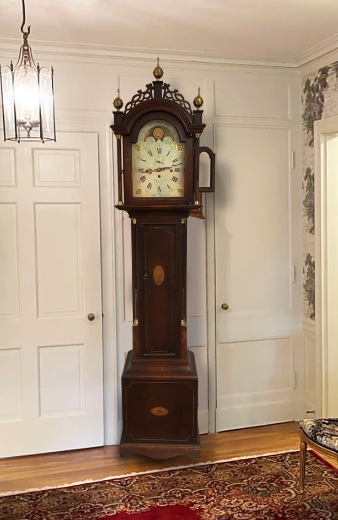 Mahogany grandfather clock, 8 Tubes, Thomas Long Co., Boston, Mass. phase and moon dial, with sailing ship, and country cottage scene. Beautifully inlaid case with American eagle with shield and arrows, stars and urn, mahogany. Thomas Long opened his Boston-based jewelry business in 1878. It was the beginning of New England's love affair with Long's since then. Long has become the foundation of Boston's luxury jewelry and timepiece market.