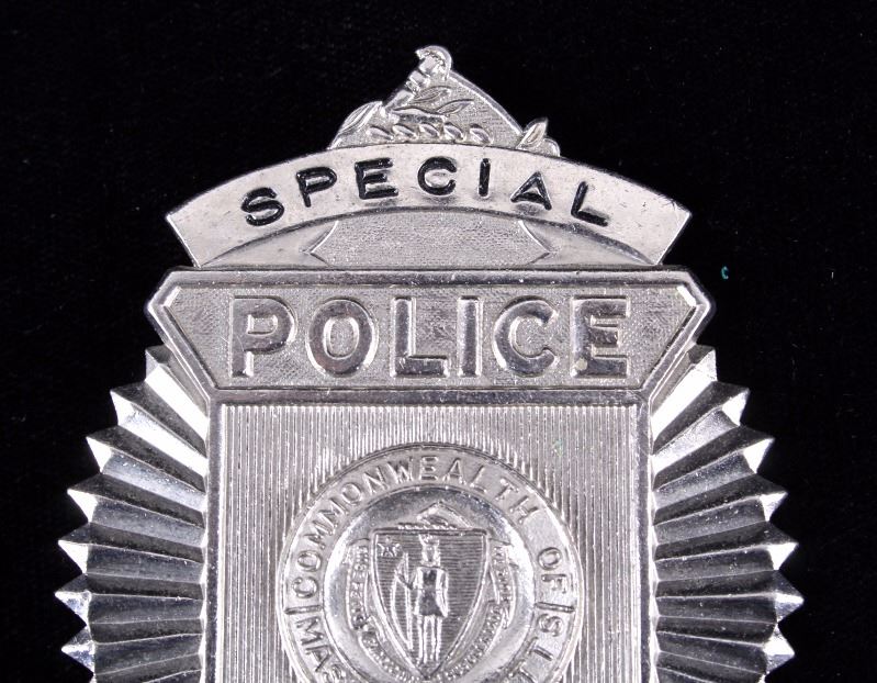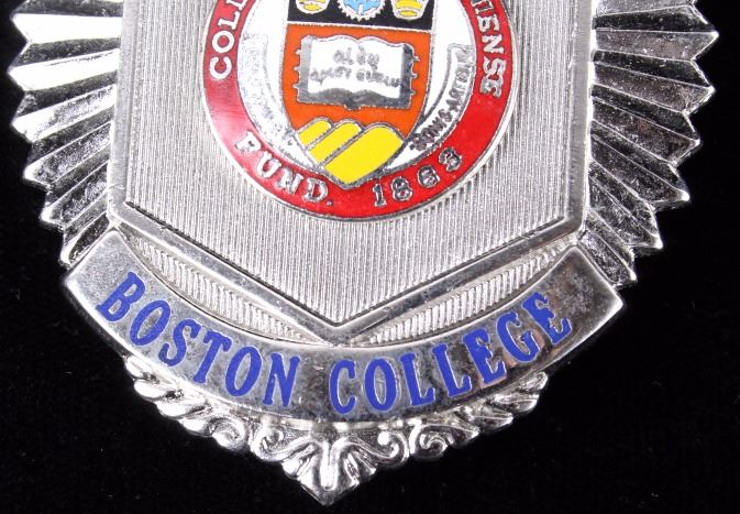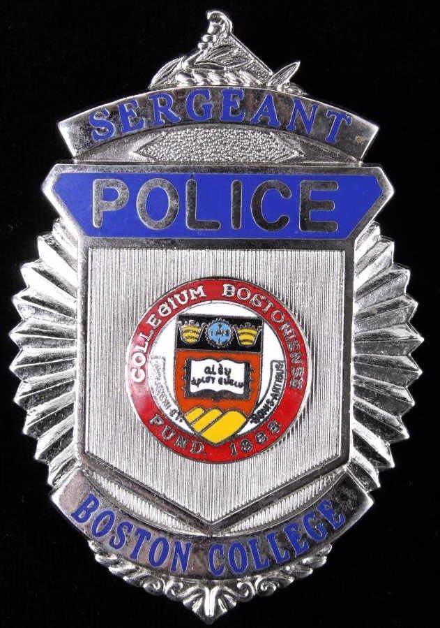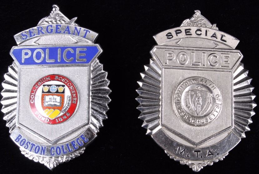 These are a Boston College Sergeant and Metropolitan Transportation Authority law enforcement metal badges. These Boston law enforcement badges show good condition silver toned and enameled lettering and center state seals. These vintage badges have embossed backs and no hallmarks. They measures 2 3/8 " x 3 1/8".