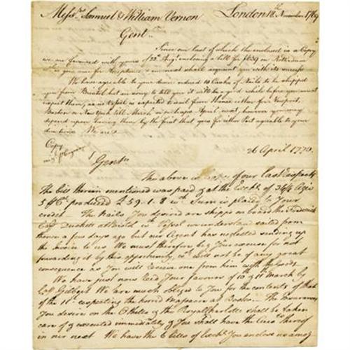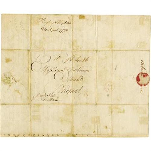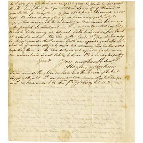 <B><B>oston Massacre 1770 Merchant Letter Reference.</B></I> An autograph letter from the London firm of Hayley and Hopkins to the Newport firm of Samuel and William Vernon, two pages with integral address leaf, 7.5" x 9", plain paper, April 26, 1770. The Boston Massacre was an incident involving the deaths of five American civilians at the hands of British troops on March 5, 1770 when a tense situation due to a heavy British military presence boiled over inciting a riot between soldiers and civilians. This letter reads, in part, "<I>...The above is copy of our last respects... The nails you deisred are shipp'd on board the Frederick... the vessel we understand sailed from thence a few days ago but our agent has neglected sending up the invoice to us. We must therefore beg your excuse for not forwarding it by this opportunity, w'ch will not be of any great consequence as you will receive one from him with the goods. We have just now rec't your favours of 10th and 11th March by Capt. Gilbert. We are much obliged to you for the contents of that of the 11th </B></I><B><I>respecting the horrid Massacre at Boston</B></I></B></I><I>. The Insurances you desire on the Othello & the Royal Charlotte shall be taken care of & executed immediately... The Tea & other goods w'ch you desire may be shipped provided the Revenue Acts are repealed & not otherwise shall be of course obliged to omitt till we have your further orders respecting them as the Tea duty is not repealed & as far as we can understand is not likely to be so We are very respectfully, Gentlemen,... Since we wrote the above we have rec't the invoice of the nails shipped at Bristol w'ch we now enclose...</B></I>" Fine condition with minor old glassine repairs affecting no text.<BR><BR>Interestingly, Samuel and William Vernon were merchants who made much of their wealth trafficking in slaves. Newport ships took New England rum to Africa to purchase slaves which they took to the West Indies to trade for molasses which they then used to make more rum. At times, they would take the slaves to South Carolina to trade for rice. Between 1725 and 1808, Newport ships took approximately 100,000 people into slavery.<BR><BR><b>Shipping:</b> Flat Material, Small (<a target="_blank" href="http://www.heritageauctions.com/common/shipping.php">view shipping information</a>)