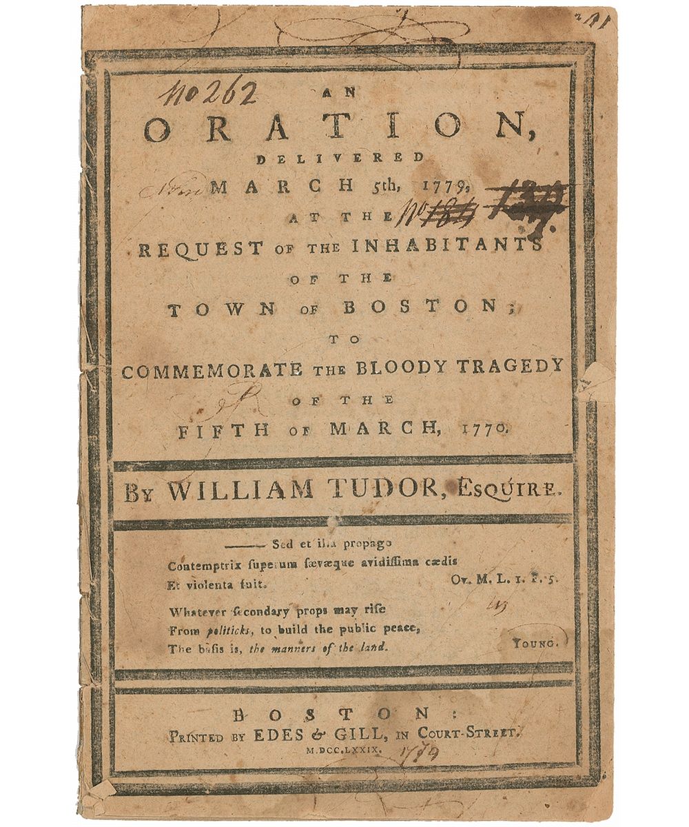 Revolutionary War-dated printed pamphlet entitled “An Oration, delivered March 5th, 1779, at the Request of the Inhabitants of the Town of Boston; to Commemorate the Bloody Tragedy of the Fifth of March, 1770, By William Tudor, Esquire,” 5.25 x 8, 18 pages, printed by Edes and Gill. Signed across the top of the first page, “Thos. Jackson April 15 1801.” Some of the passages inside have been underlined, while others have been crossed out with several added corrections. In very good condition, with a few closely trimmed pages affecting the last letters of some lines, scattered soiling and foxing, and fragile thread binding. Each year since 1770, at a town meeting held in Faneuil Hall, a person was asked to deliver an oration to mark the anniversary of the Boston Massacre, including Dr. Joseph Warren in 1772 and 1775, and John Hancock in 1774.