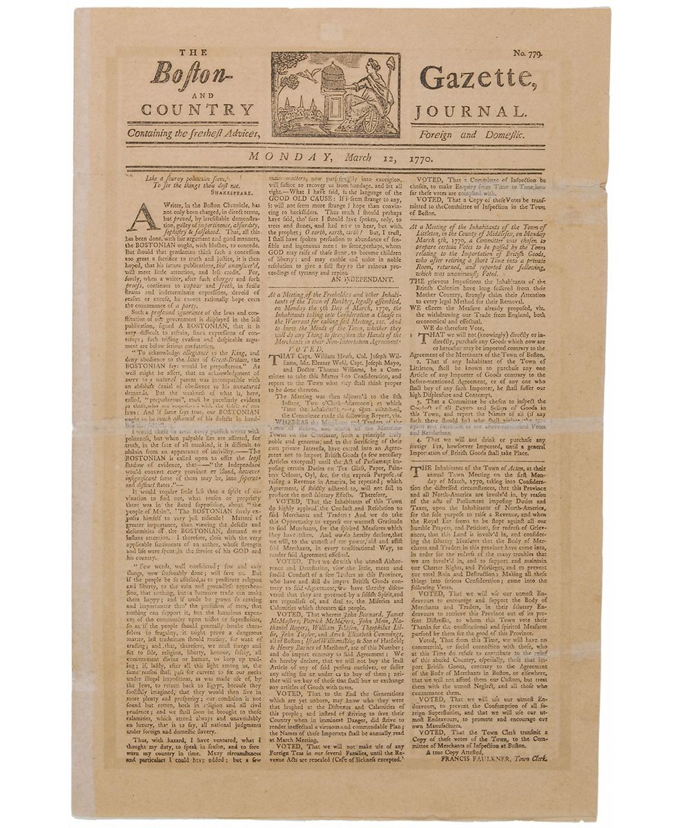 Boston Gazette and County Journal newspaper reporting on the Boston Massacre reprinted in 1876 to celebrate the Revolutionary War Centennial, four pages, 10.5 x 15.75, March 12, 1770. The three columns on pages two and three are black-bordered, with four drawn coffins printed on page three, each with the initials of the Bostonians who were killed: “SG,” “SM,” “JC,” and “CA.” An account of the event, in part: “Capt. Preston with a party of men with charged bayonets, came from the main guard to the commissioner's house, the soldiers pushing their bayonets, crying, make way! They took place by the custom house and, continuing to push to drive the people off pricked some in several places, on which they were clamorous and, it is said, threw snow balls. On this, the Captain commanded them to fire.” In very good condition, with noticeably repaired separations to fold and uniform toning.