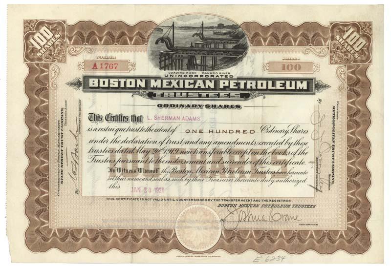 1920, Massachusetts. Stock certificate for 100 shares. Brown/Black. Engraved vignette of the "Loading Rack - Panuco River" at top center. Uncancelled and extremely fine.