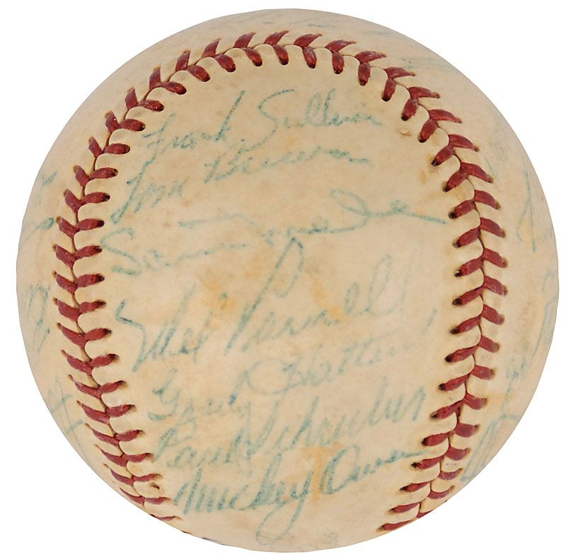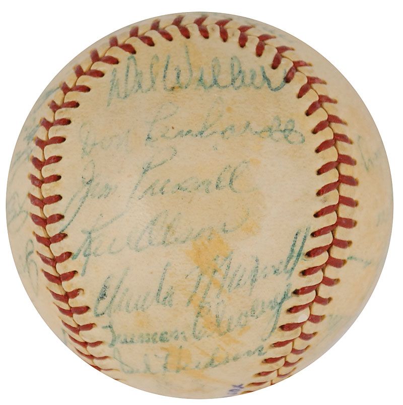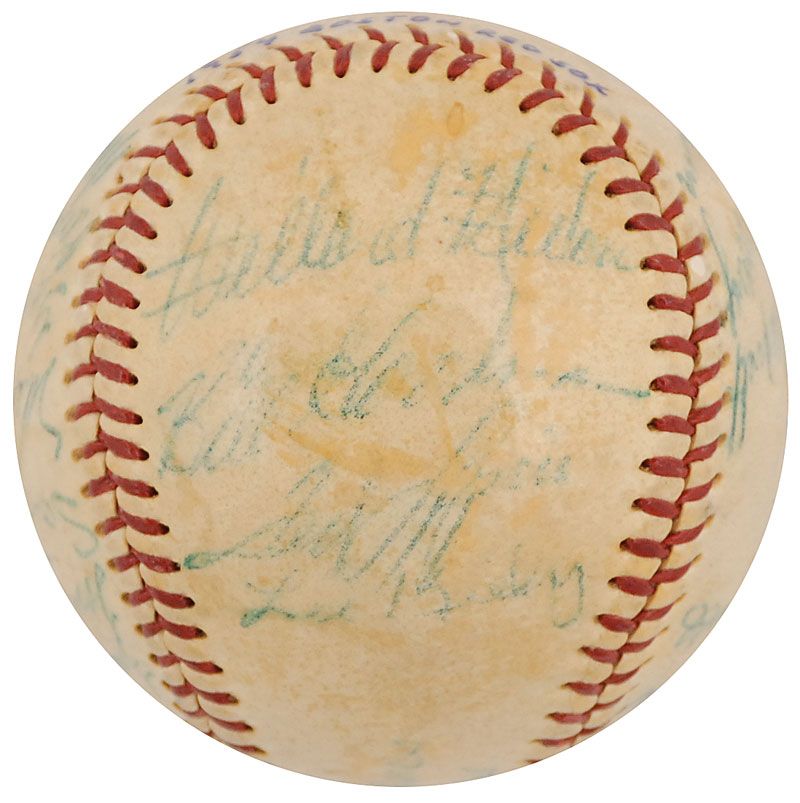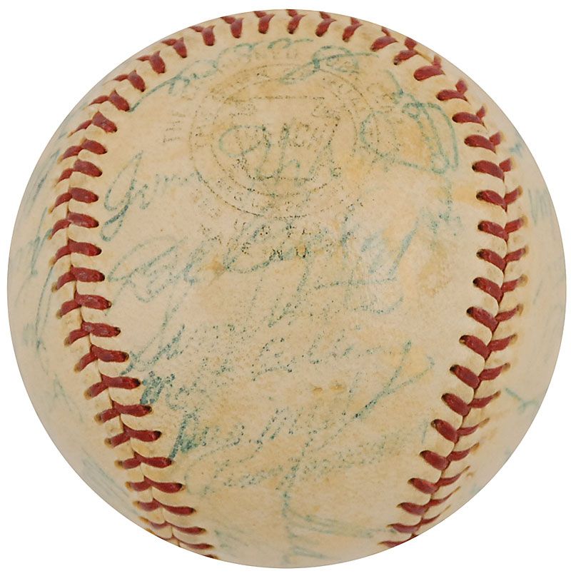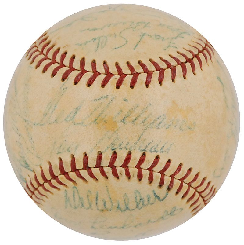 Official Reach American League (Harridge) baseball signed in blue ballpoint on the sweet spot and side panels by 27 members of the 1954 Red Sox team, including: Ted Williams (ss), Lou Boudreau (ss), Jim Piersall, Billy Goodman, Frank Sullivan, Sam Mele, Mel Parnell, Milt Bolling, Ted Lepcio, Willard Nixon, Del Wilber, Sammy White, Grady Hatton, Leo Kiely, Don Lenhardt, Karl Olson, Mickey Owen, Charlie Maxwell, Sid Hudson, Tex Clevenger, Hal Brown, Tom Hurd, Buster Mills, George Susce, Del Baker, Paul Schreiber, and one other. In very good condition, with scattered toning, an overall coat of shellac, and signatures light with the majority legible.