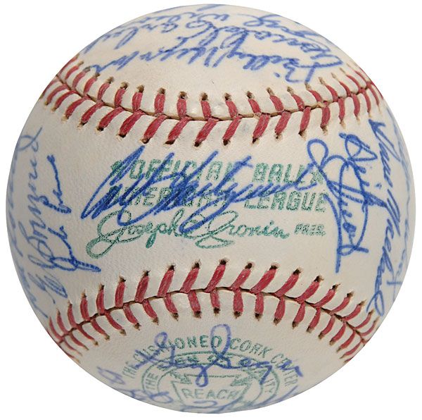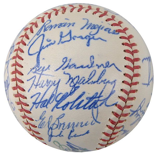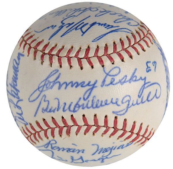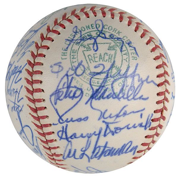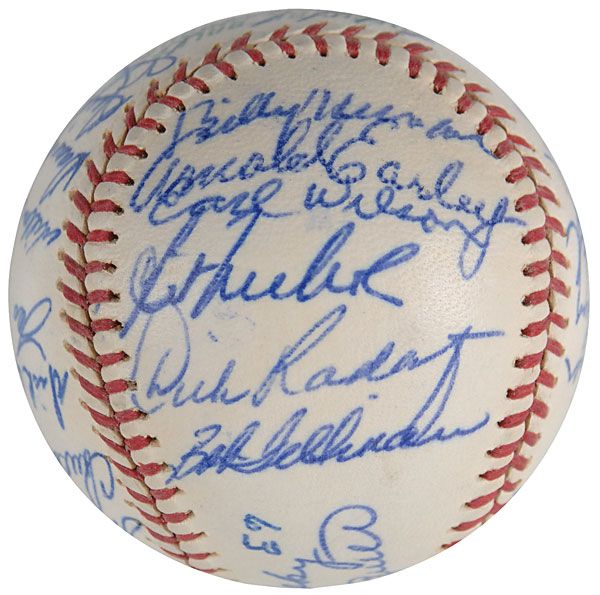 Official Reach American League (Cronin) baseball signed in blue ballpoint on the sweet spot and side panels by 29 members of the 1963 team. Signers include: Carl Yastrzemski (over the league stamp), Johnny Pesky (ss), Bill Monbouquette (ss), Dick Williams, Dick Radatz, Frank Malzone, Chuck Schilling, Earl Wilson, Russ Nixon, Felix Mantilla, Dick Stuart, Bob Tillman, Lou Clinton, Wilbur Wood, Dave Morehead, Roman Mejias, and Billy Gardner. In fine condition, with mild haloing to the bold signatures.