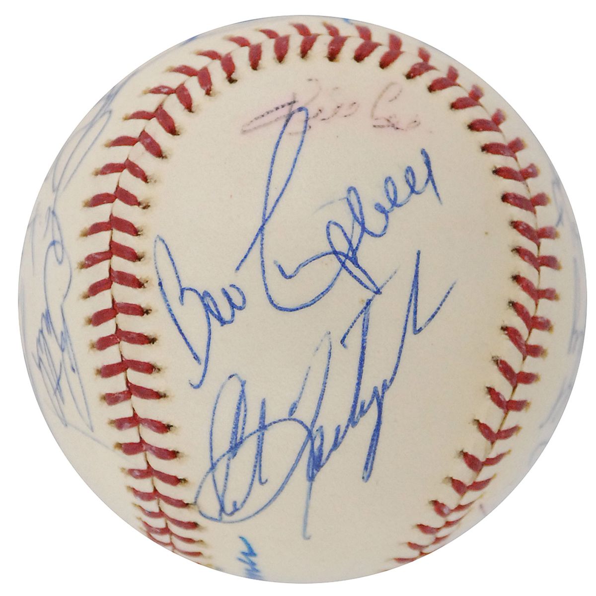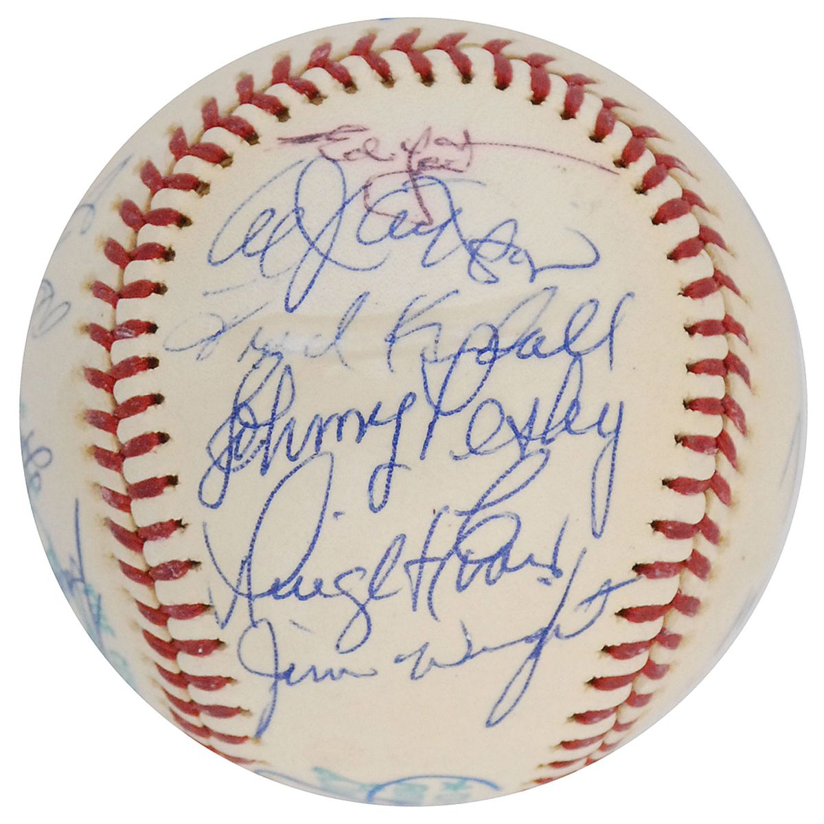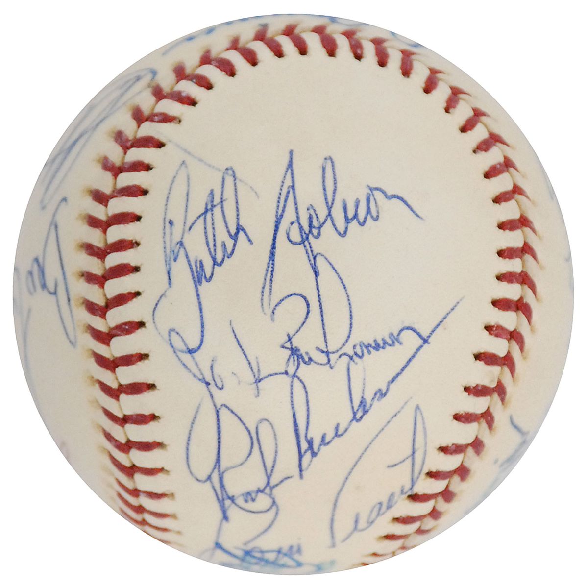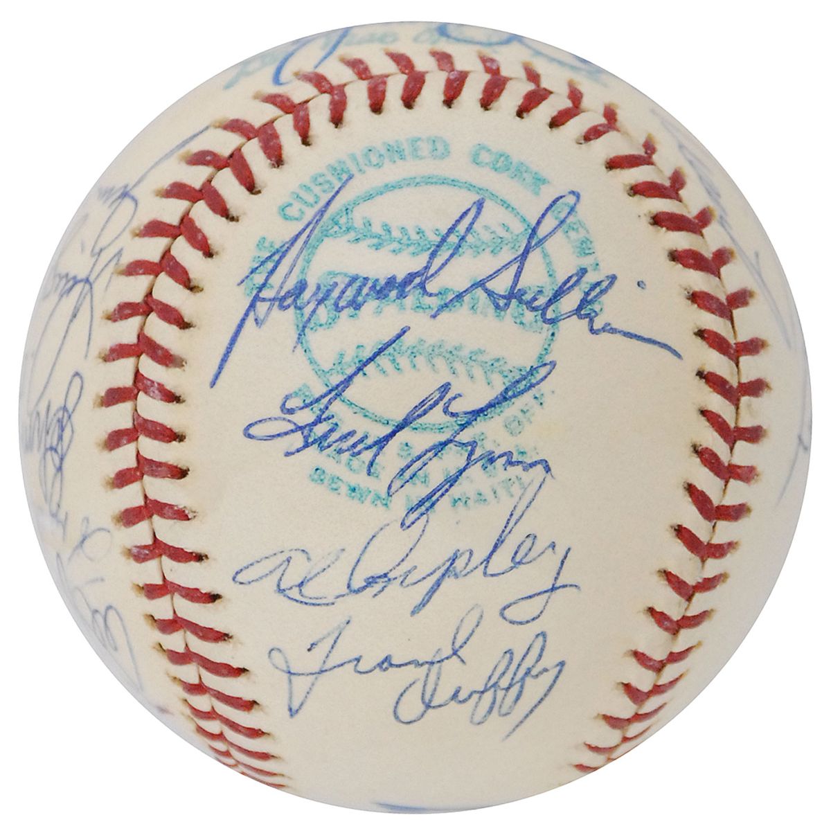 Official Spalding American League baseball signed on the sweet spot and side panels in felt tip and ballpoint by 19 members of the 1978 Red Sox team, including: Carl Yastrzemski, Dwight Evans, Fred Lynn, Luis Tiant, Bill Lee, Johnny Pesky, Don Zimmer (ss), Haywood Sullivan, Butch Hobson, Rick Burleson, Jack Brohamer, Frank Duffy, Al Ripley, Bill Campbell, Ed Yost, Jim Wright, Fred Kendall, Al Jackson, and one other. In fine condition, with the Lee and Yost signatures a bit faded, and a scuff mark to the Kendall signature.