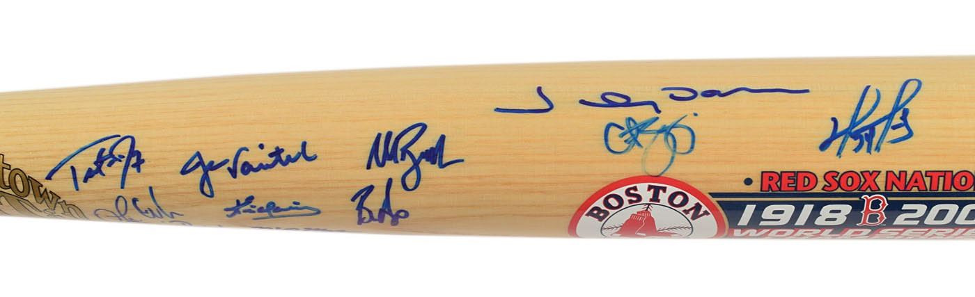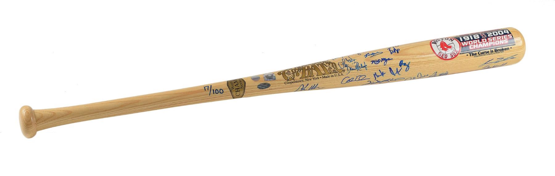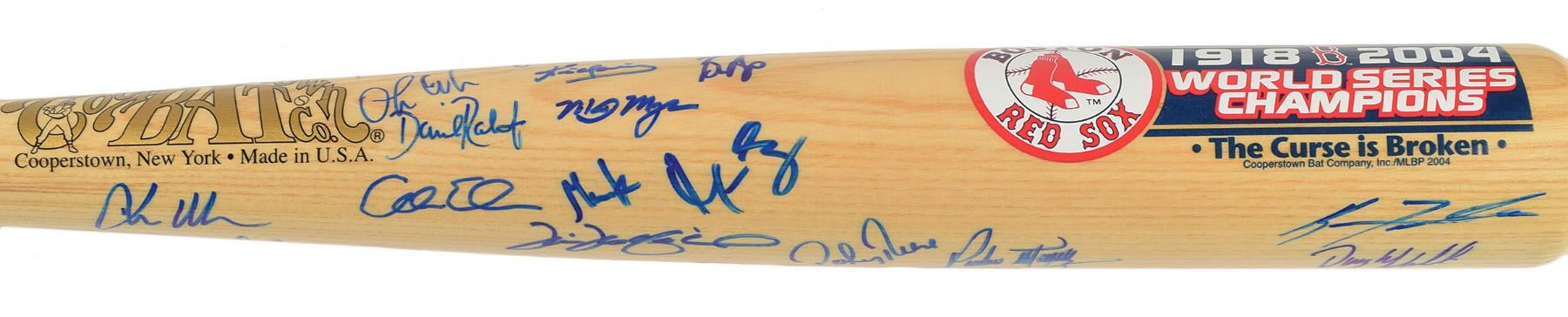 Fantastic limited edition Cooperstown Bat Co. baseball bat honoring the 2004 Red Sox World Series championship, numbered 17/100, signed in blue felt tip on the barrel by 23 members of the team, including: David Ortiz, Pedro Martinez, Manny Ramirez, Curt Schilling, Johnny Damon, Dave Roberts, Keith Foulke, Derek Lowe, Tim Wakefield, Jason Varitek, Trot Nixon, Kevin Youkilis, Mark Bellhorn, Orlando Cabrera, Kevin Millar, Pokey Reese, Bronson Arroyo, Gabe Kapler, Alan Embree, Mike Myers, Doug Mirabelli, Ramiro Mendoza, and Curtis Leskanic. In fine condition. Accompanied by a certificate of authenticity from Steiner Sports. A fantastic multi-signed item from the team that finally 'reversed the curse.'