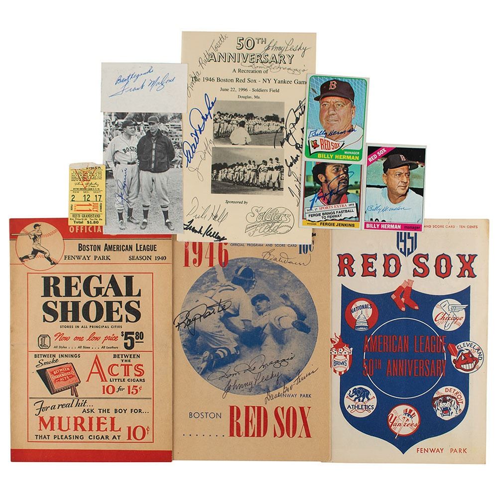 Six items signed by Red Sox notables, including: an original 1946 Fenway Park program, signed later on the front cover by Dom DiMaggio, Johnny Pesky, Dave 'Boo' Ferriss, Bobby Doerr, Roy Partee, Eddie Pellagrini, and Don Gutteridge; a 1996 program honoring the 50th anniversary of the '46 squad, signed by Dom DiMaggio, Johnny Pesky, Walt Dropo, Roy Partee, Ted Lepcio, and others; a postcard signed by Joe Cronin; two 1960s Topps cards signed by Billy Herman; a 1974 Topps card signed by Fergie Jenkins; and a signature of Frank Malzone. Unsigned ephemera includes a 1946 Fenway Park ticket stub; programs from 1940, 1950, and 1951 ; and form letters from Jean Yawkey and Dick O'Connell. In very good to fine condition, with creasing to the signed Fergie Jenkins card.