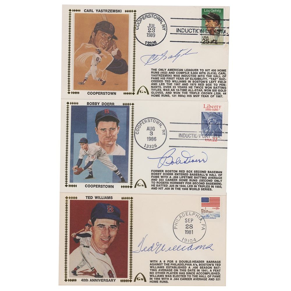 Three Gateway covers with silk color cachets honoring Boston Red Sox legends, individually signed in blue ink by Ted Williams, Carl Yastrzemski, and Bobby Doerr. In overall fine condition.