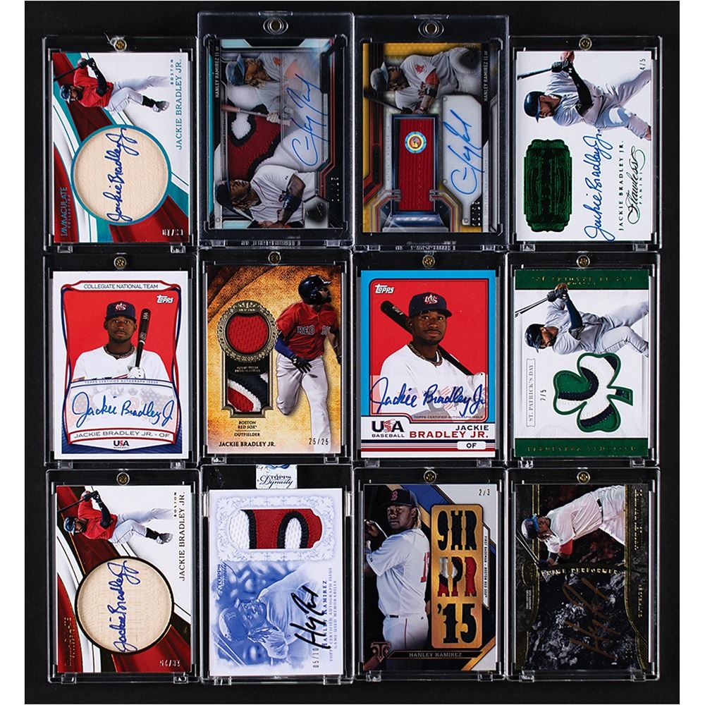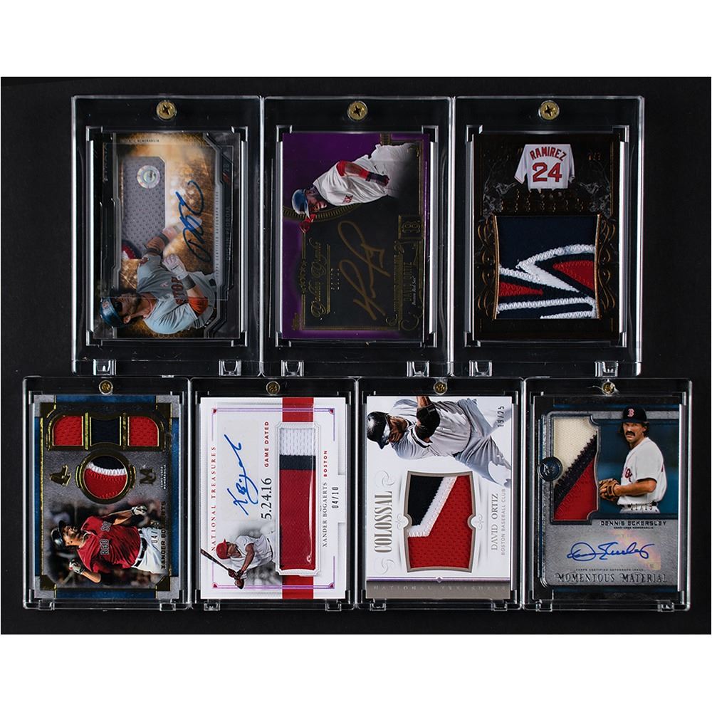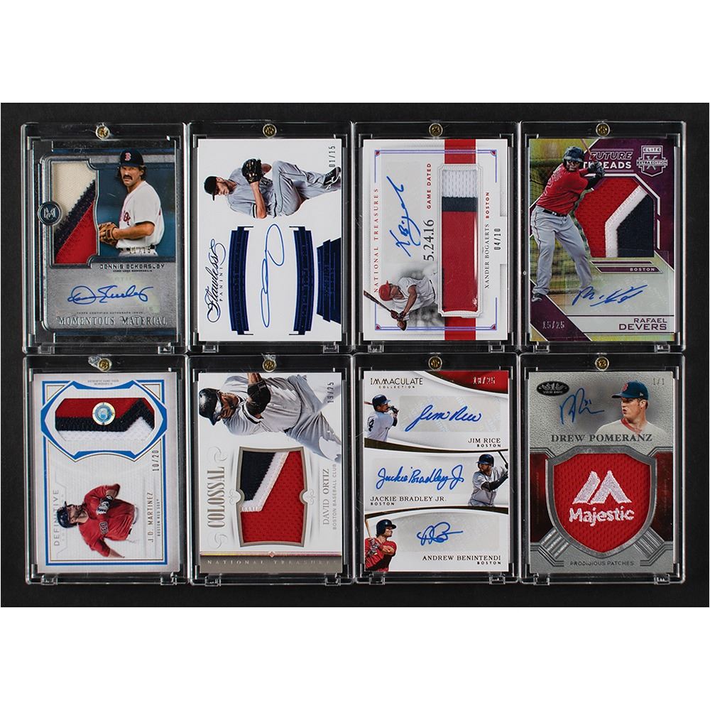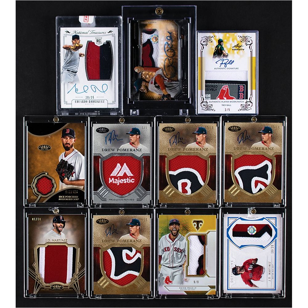 Amazing hoard of 56 modern autograph and relic cards of Boston Red Sox stars past and present, many with colorful game-used patch swatches and several signed by the subjects. Especially notable are autographs from David Ortiz, Dustin Pedroia, Chris Sale, Dennis Eckersley, Rafael Devers, and Xander Bogaerts, as well as outstanding game-used patch cards of Manny Ramirez, David Ortiz, Andrew Benintendi, and several others. The collection is broken down by player below: