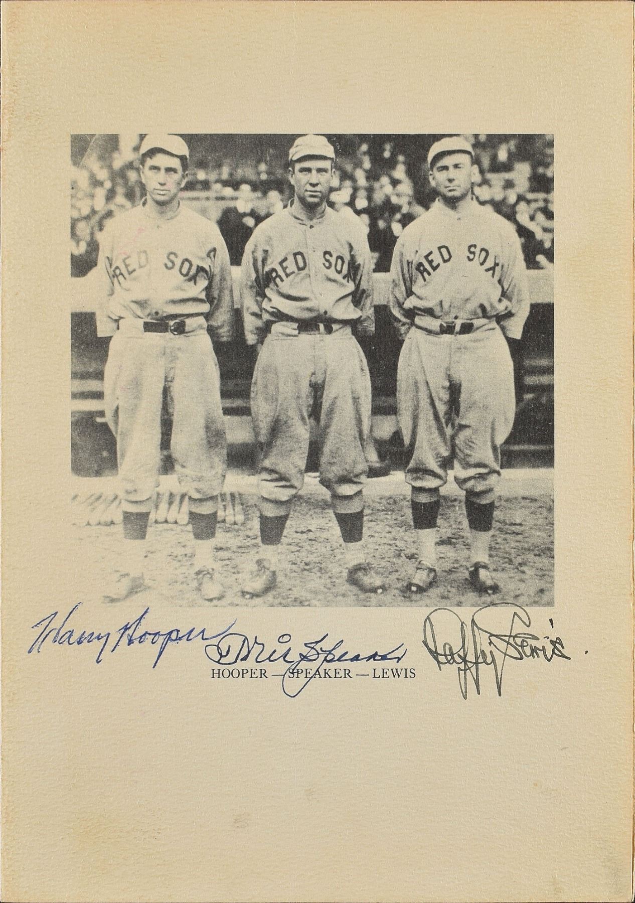Scarce dinner program for an event honoring the 'Golden Outfield' of the Boston Red Sox, 6.75 x 9.5, signed below their image on the front cover in blue ballpoint, "Harry Hooper," in black ink, "Tris Speaker," and in fountain pen, "Duffy Lewis." In excellent overall condition, with some light soiling.
