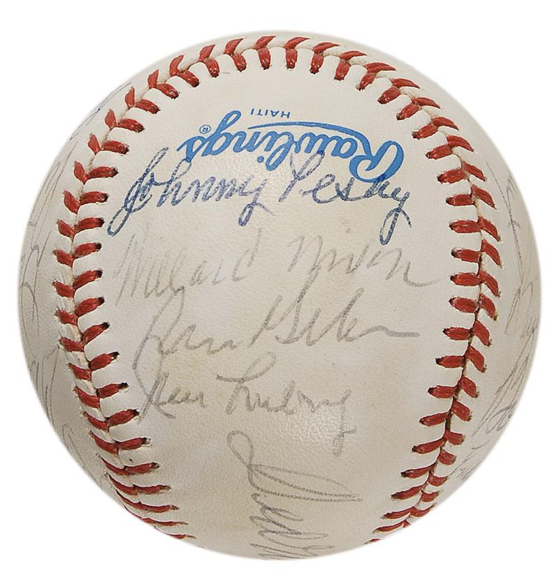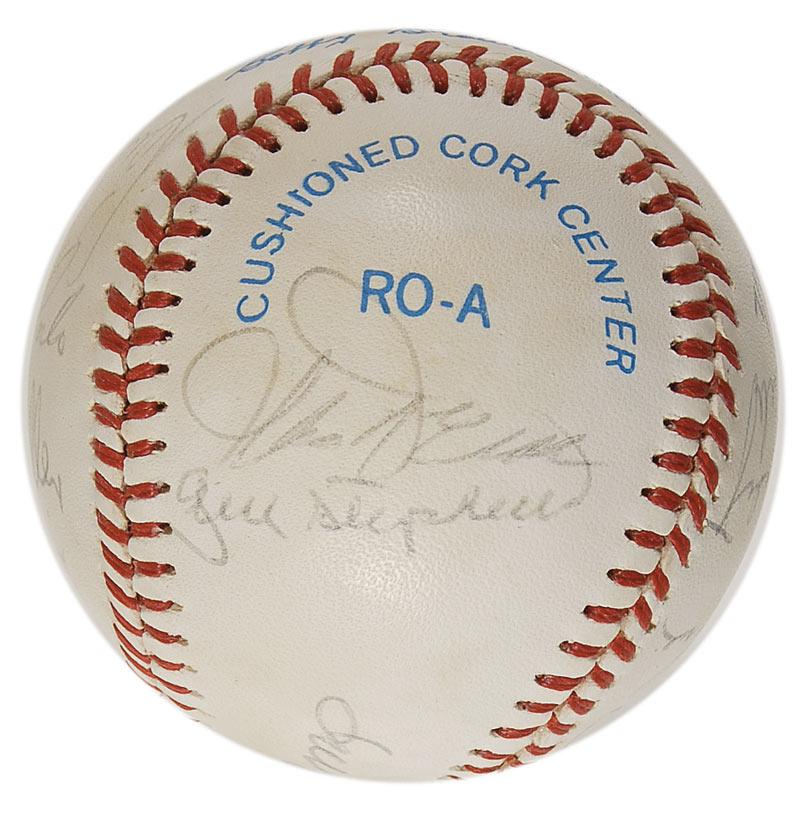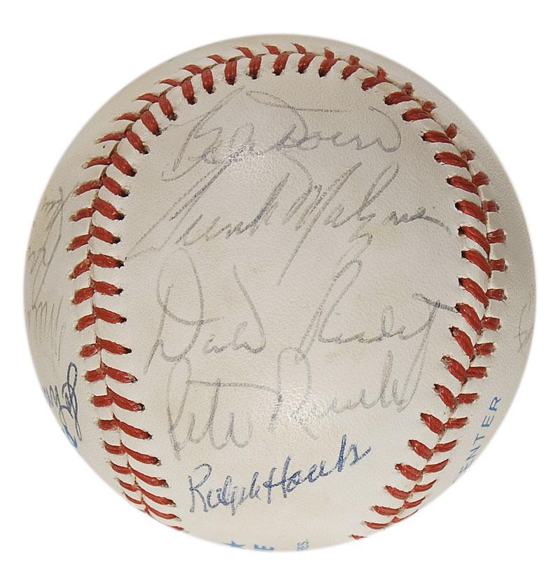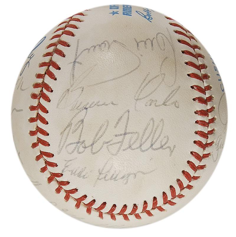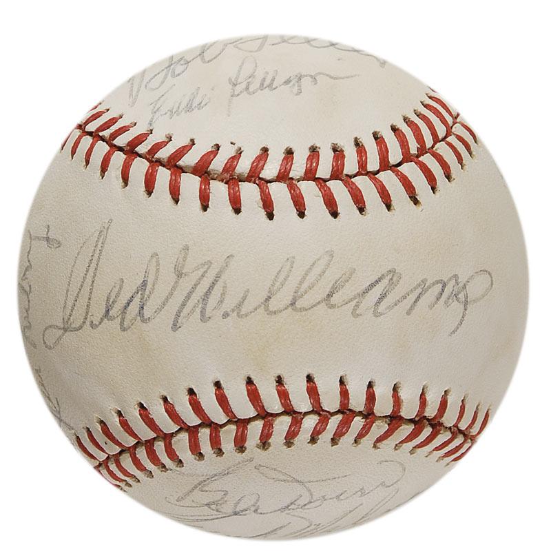 Official Rawlings American League baseball signed in black ballpoint by sixteen Boston Red Sox old-timers or baseball legends. Signers include: Ted Williams (ss), Luis Tiant, Johnny Pesky, Bob Doerr, Willard Nixon, Pete Runnels, Dick Radatz, and Bob Feller. Ball also bears a clubhouse signature of Ralph Houk. In fine condition with scattered toning.