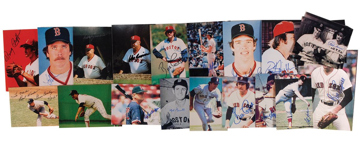 Twenty-two signed photos, various finishes, ranging in size from 4.5 x 4 up to 5.25 x 7.25, each signed in ink or felt tip by the respective player pictured. Signers are: Bob Doerr (3), Bill Campbell (3), Rick Miller, Jimy Williams, Dave Stapleton, Steve Renko, Glen Hoffman, Mel Parnell, Bob Ojeda, Skip Lockwood, Doug Griffin, Gary Allenson, Don Zimmer (2), and Gene Conley (2). In fine condition, with some light staining to Parnell’s photo.