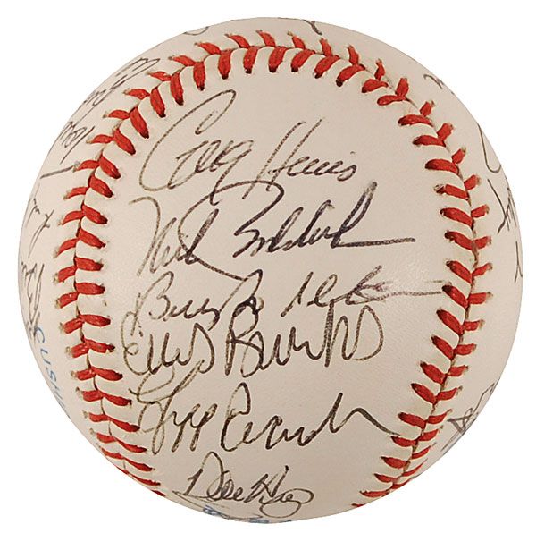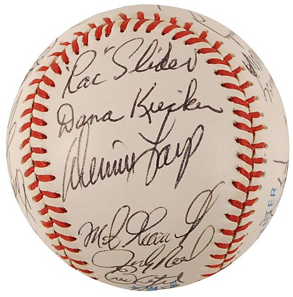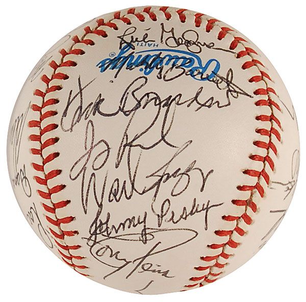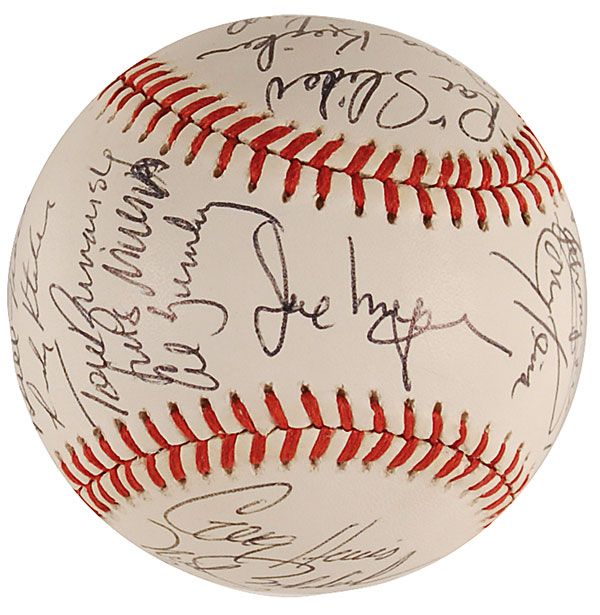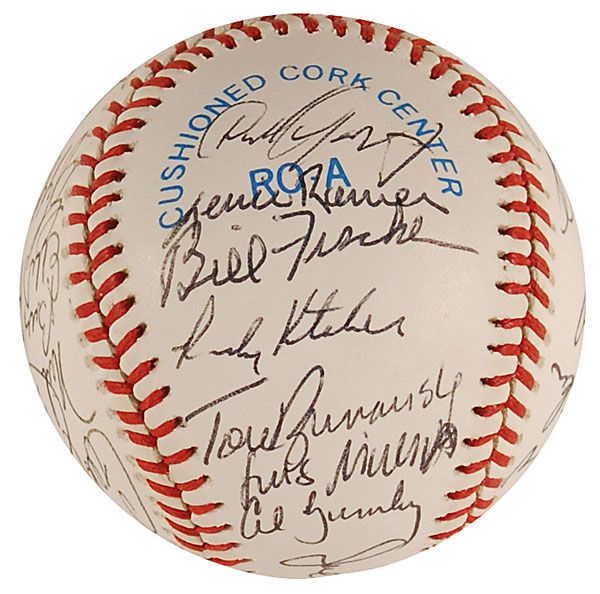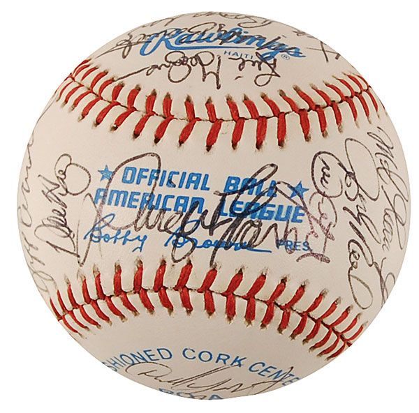 Official Rawlings American League baseball signed in black ballpoint on the sweet spot and side panels by 28 members of the 1990 Red Sox team (1990 American League East champions). Signers include: Wade Boggs, Johnny Pesky, Dwight Evans, Mike Greenwell, T