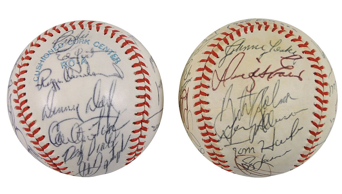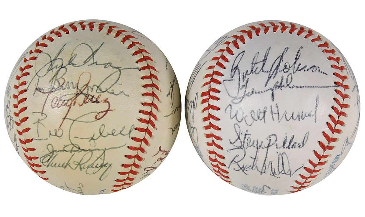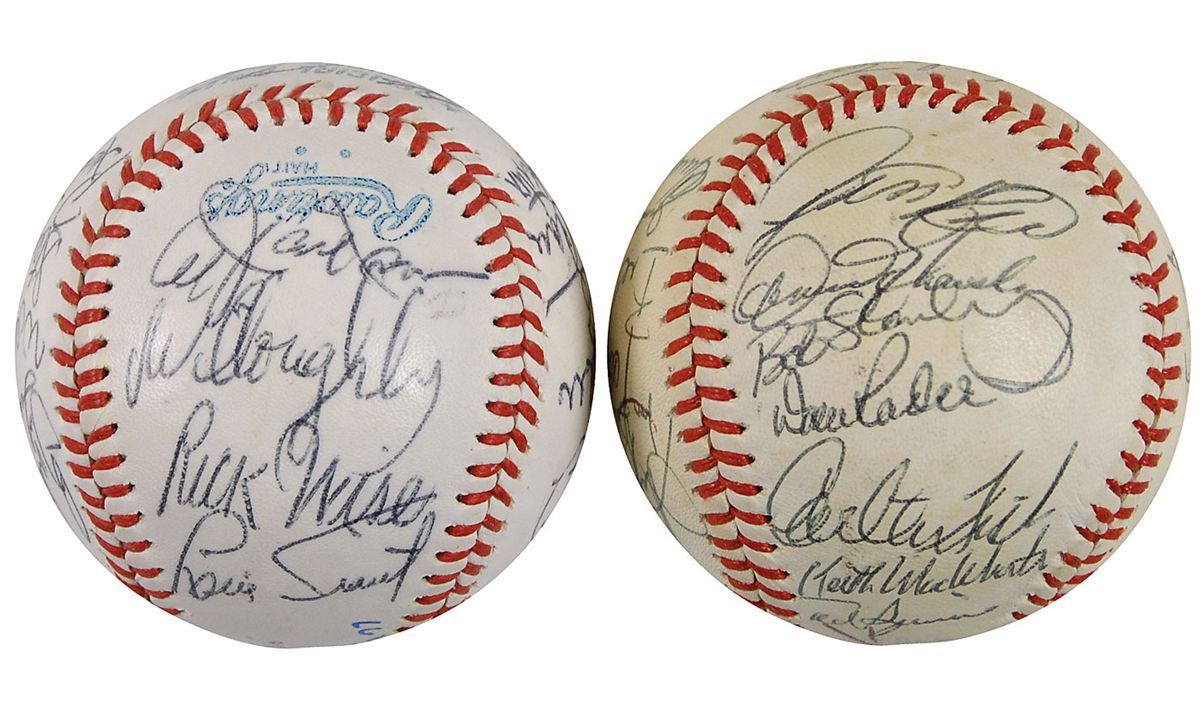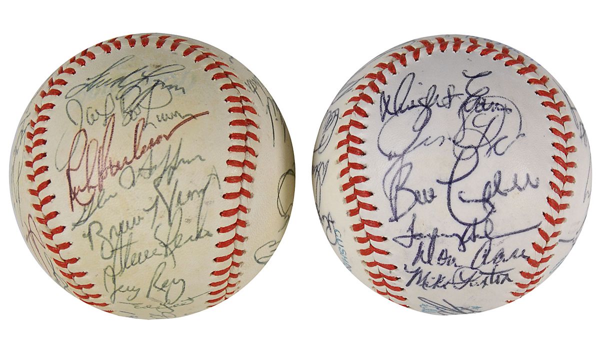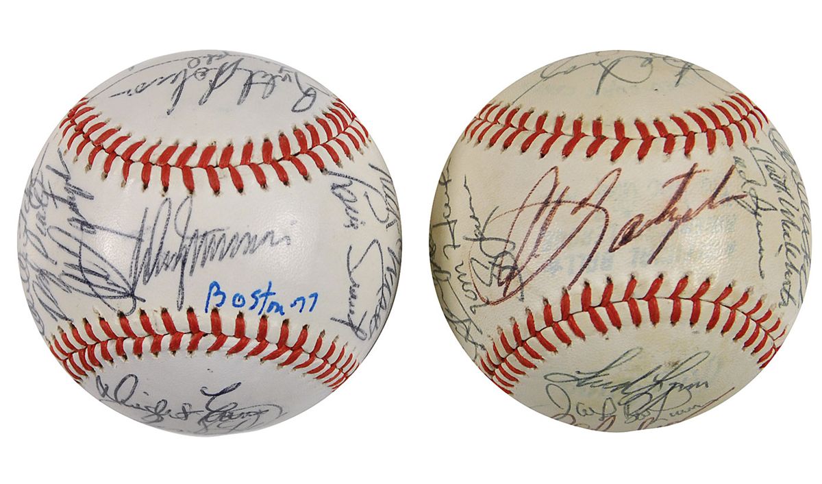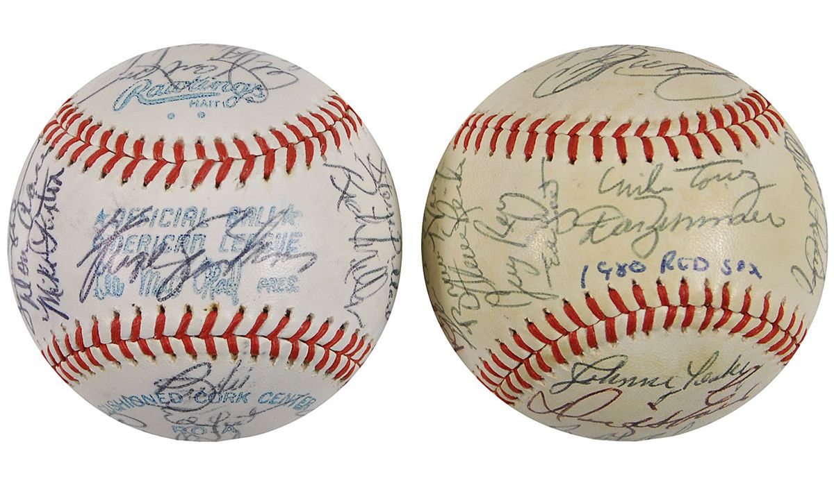 Two Official Rawlings American League baseballs, one signed on the sweet spot and side panels by 24 members of the 1977 Red Sox team, and the other by 29 members of the 1980 team. Signers of the 1977 baseball include: Carl Yastrzemski, Carlton Fisk, Jim Rice, Fergie Jenkins (over league stamp), Dwight Evans, Bill Lee, Luis Tiant, Don Zimmer (ss), Rick Wise, Butch Hobson, Steve Dillard, Don Aase, Mike Paxton, Rick Miller, Denny Doyle, Ed Yost, Reggie Cleveland, and Jim Willoughby. Signers of the 1980 ball include: Carl Yastrzemski (over league stamp), Carlton Fisk, Jim Rice, Dennis Eckersley, Tony Perez, Johnny Pesky, Fred Lynn, Dwight Evans, Butch Hobson, Bob Stanley, Jerry Remy, Dave Rader, Keith MacWhorter, Ted Sizemore, Tom Burgmeier, Rick Burleson, Ed Yost, Glenn Hoffman, Bill Campbell, Jim Dwyer, Chuck Rainey, and Mike Torrez (ss). In overall fine condition, with ballpoint notations identifying years on both baseballs. The 1980 baseball also bears a clubhouse signature of Don Zimmer on the sweet spot.