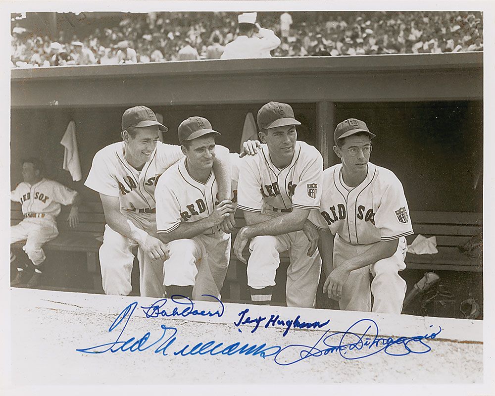 Choice glossy 10 x 8 photo of Ted Williams, Bobby Doerr, Tex Hughson, and Dom DiMaggio on the dugout steps at Fenway Park in 1942, signed in blue felt tip by all four Red Sox legends. In fine condition, with very mild golding to image.