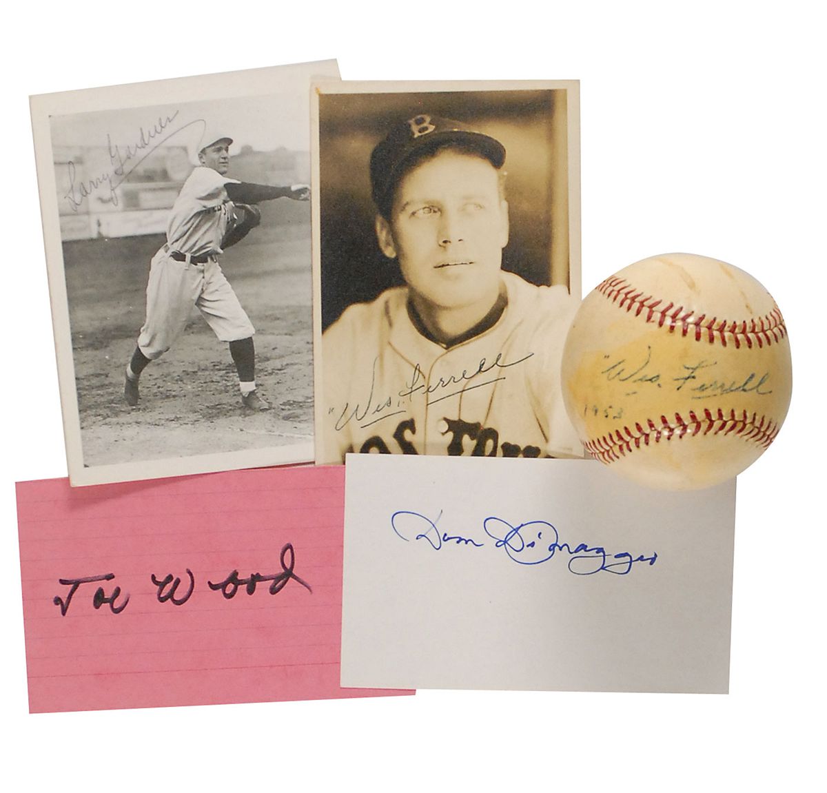 Collection of five items, each signed by a Red Sox player, including: Dom DiMaggio (signature), Joe Wood (signature), Larry Gardner (SP), and Wes Ferrell (SP and baseball). In overall very good to fine condition, with a toned layer of shellac over signature on the baseball.