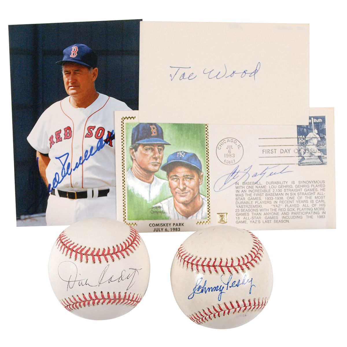 Collection of five items, each signed in felt tip or ballpoint by a Red Sox legend, including: Ted Williams (small SP), Carl Yastrzemski (FDC), Joe Wood (signature), Dick Radatz (baseball), and Johnny Pesky (baseball). In overall fine condition, with a few marks and dings to the Pesky baseball.