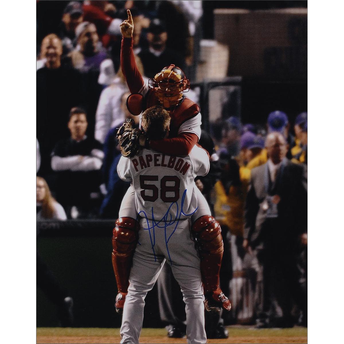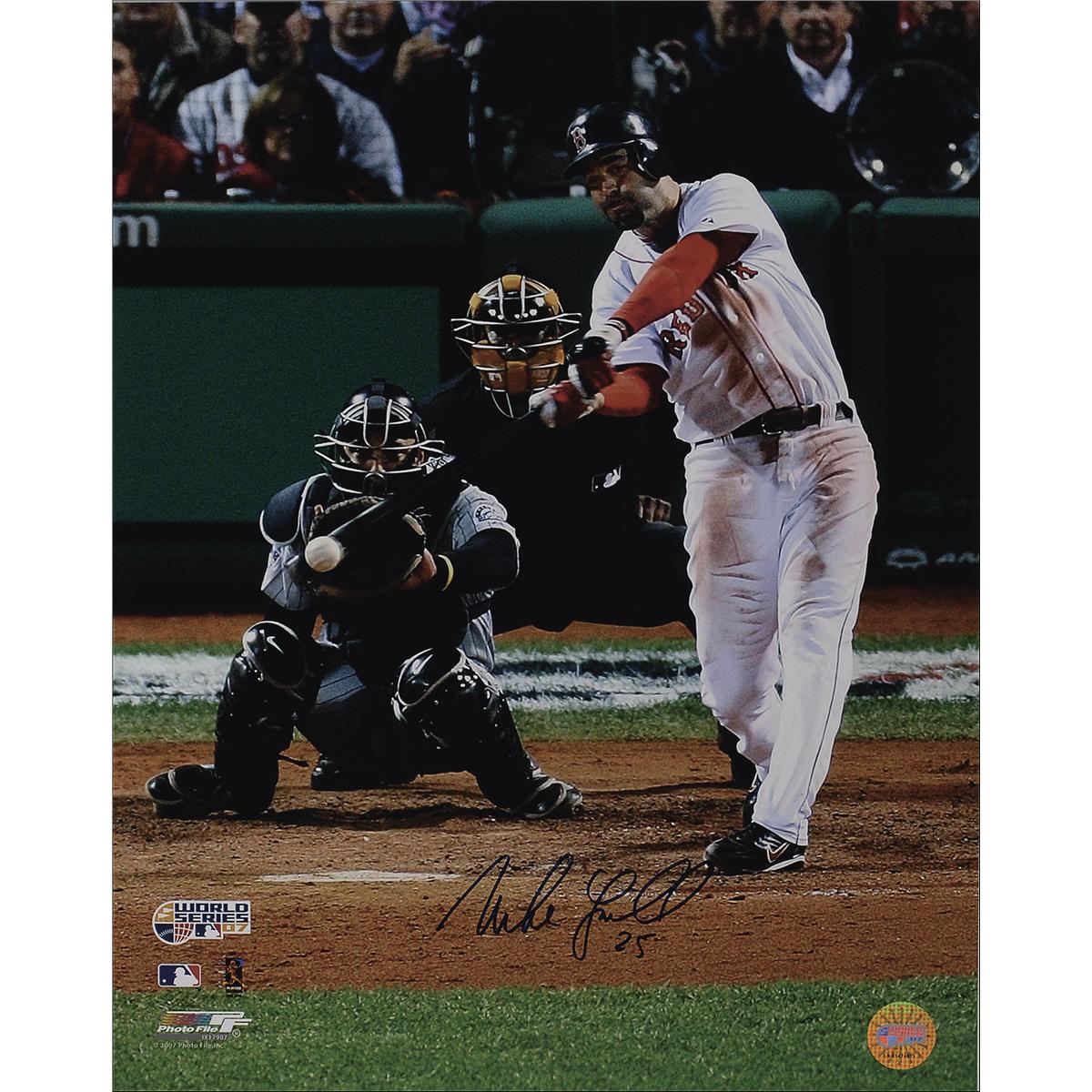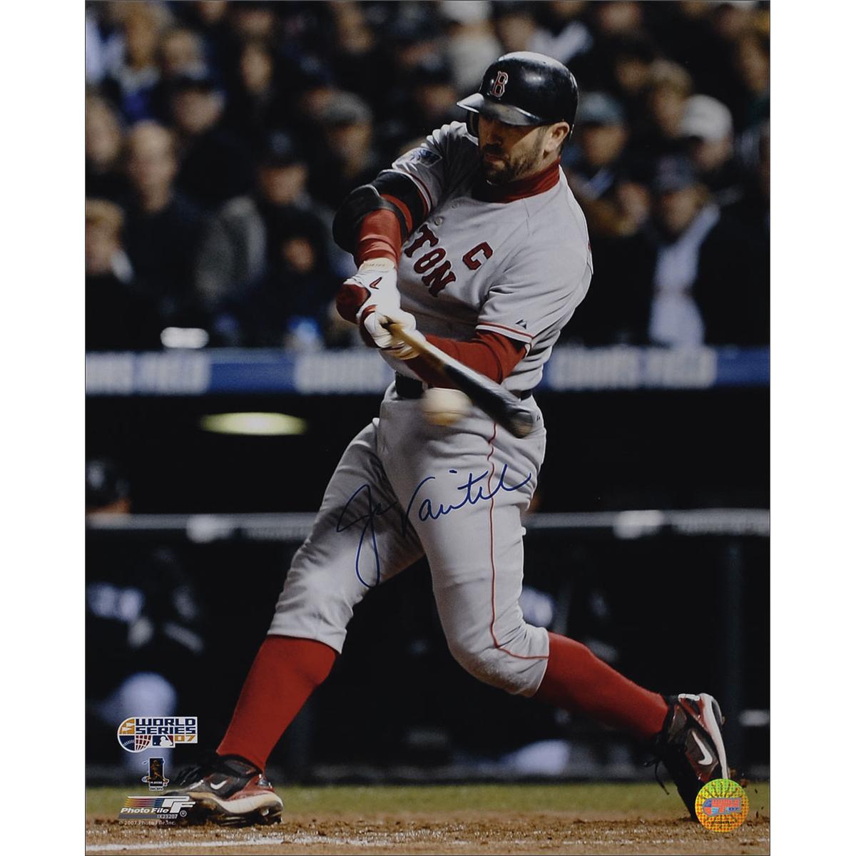 Three color glossy and satin-finish photos of players from the 2007 World Series Champion red Sox, each signed in blue felt tip by the respective player pictured. Signers are: Jason Varitek, Mike Lowell (2007 World Series MVP), and Jonathan Papelbon. In very fine condition.