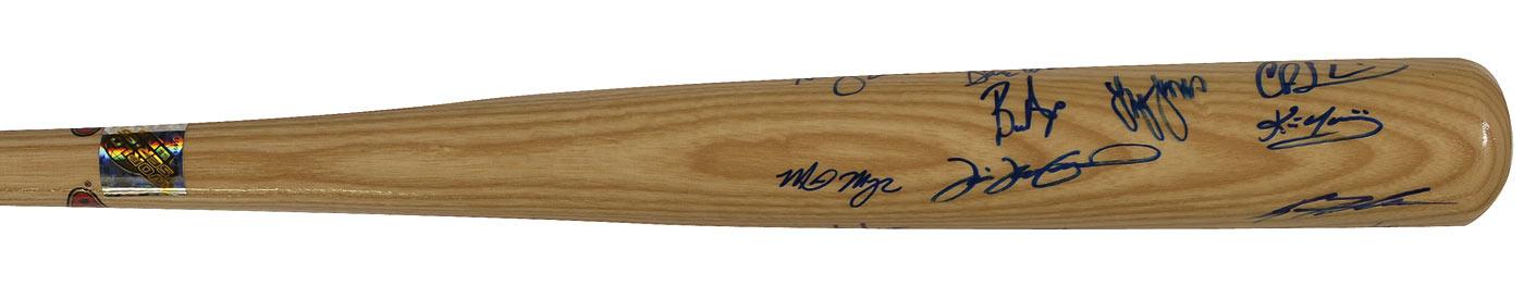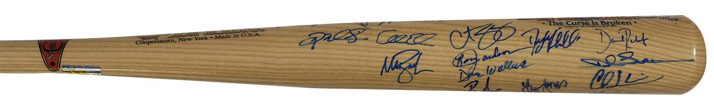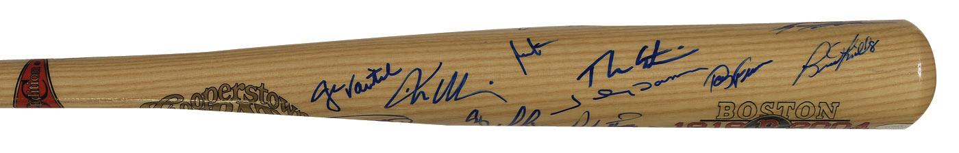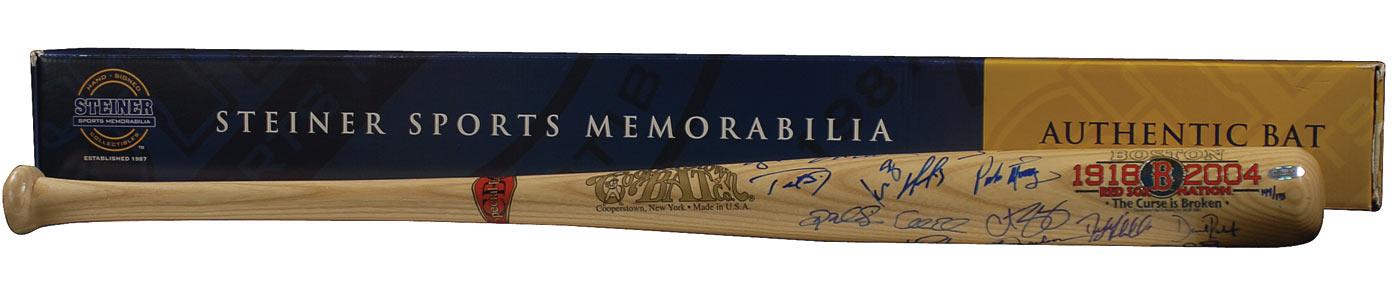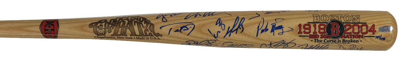 Official Cooperstown Bat Company limited edition commemorative “The Curse is Broken” 2004 Boston Red Sox baseball bat, #144/175, signed in blue felt tip on the barrel by 27 members of the World Series champions. Signers are Manny Ramirez, Curt Schilling, Pedro Martinez, David Ortiz, Terry Francona, Johnny Damon, Keith Foulke, Jason Varitek, Theo Epstein, Mark Bellhorn, Tim Wakefield, Trot Nixon, Doug Mientkiewicz, Bronson Arroyo, Kevin Millar, Dave Roberts, Alan Embree, Kevin Youkilis, Mike Myers, Gabe Kapler, Curtis Leskanic, Doug Mirabelli, Brad Mills, Lynn Jones, Dave Wallace, Ron Jackson, and Dale Sveum. In very fine condition, with a Steiner Sports authentication label affixed and accompanied by a certificate of authenticity from Steiner. Desirable lumber from a championship team 86 years in the making.