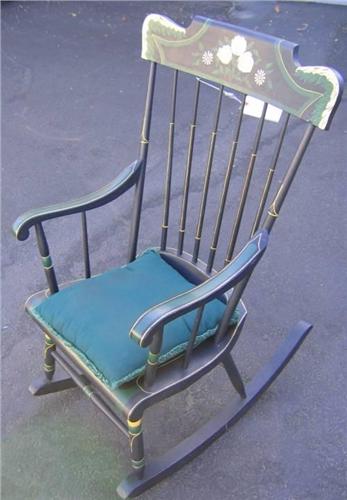 Beautiful Boston/Salem Windsor style rocker. Spindleback. Carved seat. C1900 (or before) Repainted 20th Cent. Black/green and floral flourished. 15lbs (13-9)