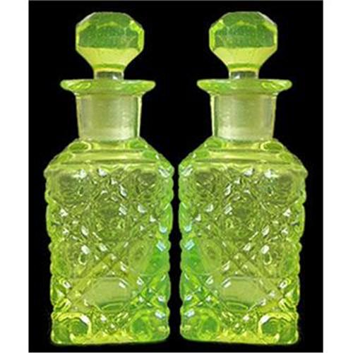 Produced in blown molded EAPG Vaseline glass by the Boston Sandwich Glass Co., between 1825 and 1888, this outstanding pair of cologne, lotion or perfume decanters in their stepped shoulder Octagon Diamond pattern. Shown and described in the Schiffer Vaseline Collectors Book 2nd Edition. Each measuring 5 12" tall x 2? wide x 2? deep and are both, including their original ground glass stopper, in excellent condition.