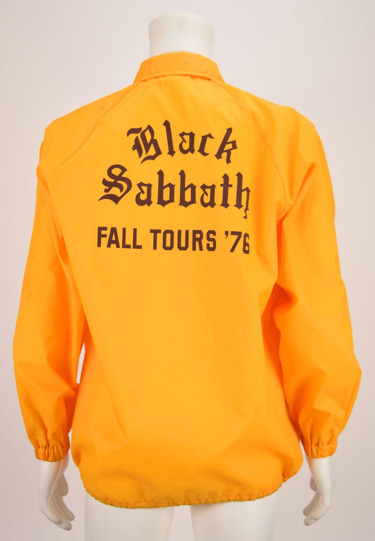 Sib Hashian's bright yellow jacket for the fall leg of Black Sabbath's 1976 Technical Ecstasy Tour, size large, with a Collegiate Pacific tag to collar, an "Obie's Lightning Productions" logo to left chest, and the back featuring large black lettering: "Black Sabbath, Fall Tours '76." Includes a "Back Stage Pass" pin for a Black Sabbath concert at the Sam Houston Coliseum in Houston, Texas, on October 23, 1976, with guest stars listed as "Boston" and "Moxy." In overall fine condition.