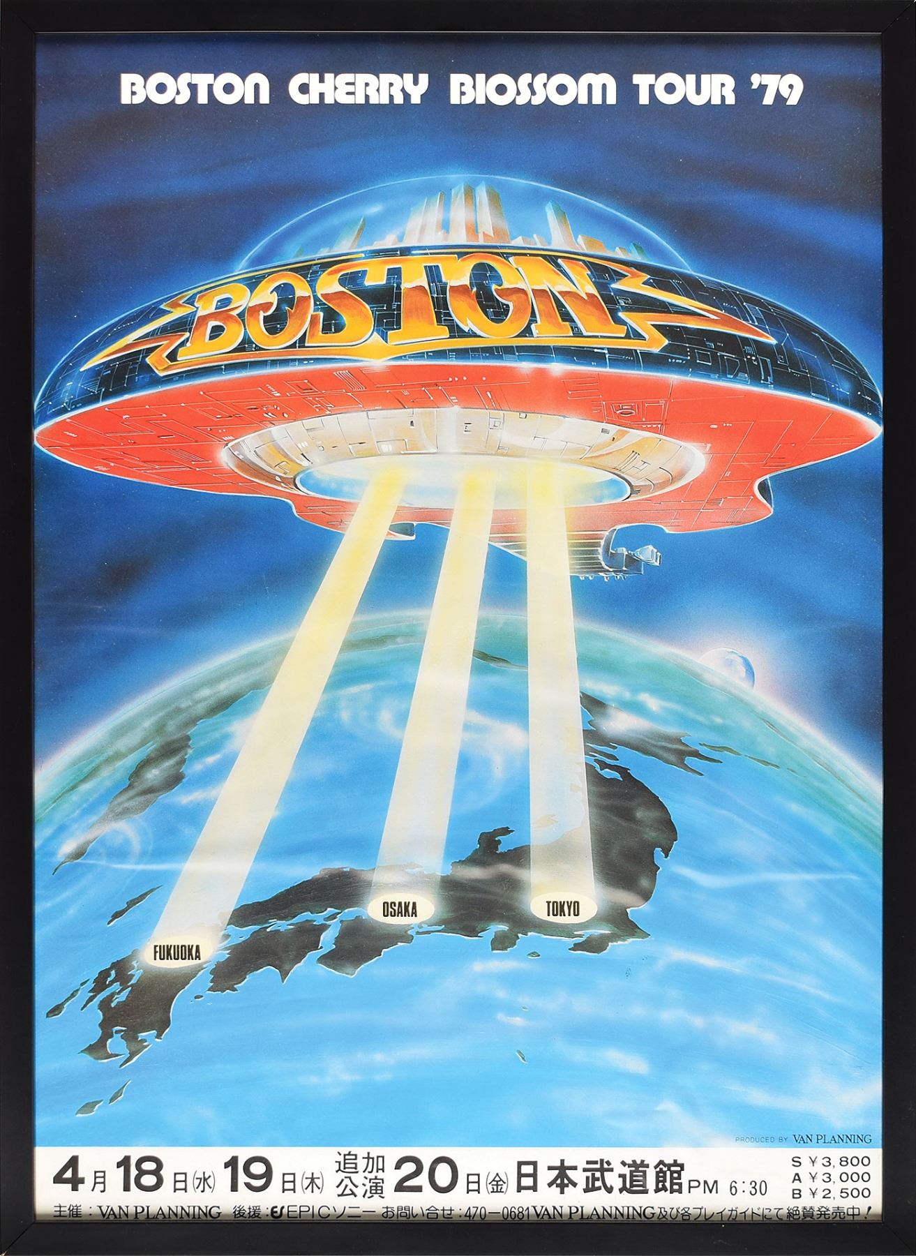 Sib Hashian's original color 20 x 28 poster for Boston's 1979 tour of Japan, showing a huge Boston spaceship casting rays of light down on their destinations in Fukuoka, Osaka, and Tokyo. White text at the top reads, "Boston Cherry Blossom Tour '79," with the dates of their shows at the bottom. Framed to an overall size of 22 x 30. In very good condition, with overall rippling.