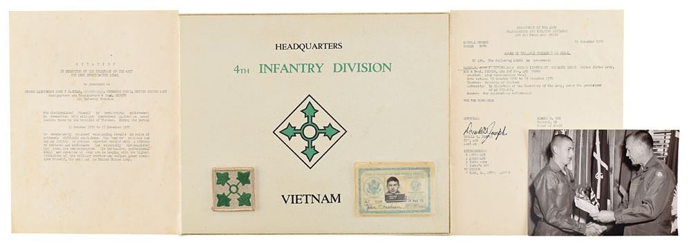 Group lot of four items from Sib Hashian's military service in the United States Army during the Vietnam War, including: Hashian's embroidered 4th Infantry Division patch; a laminated Armed Forces of the United States identification card, 3.5 x 2.25, with a small affixed photo of Hashian, who signs below, "John T. Hashian," that lists his service number and grade, "2LT USAR," with reverse featuring his thumb prints, date of birth, physical traits, date of issue, "23 Jan 70," and card number, "D160092"; a citation for "The Army Commendation Medal," as directed by the Secretary of the Army and presented to "Second Lieutenant John T. Hashian…Ordnance Corps, United States Army…4th Infantry Division, who distinguished himself by meritorious achievement in connection with military operations against an armed hostile force in the Republic of Vietnam. During the period 15 October 1970 to 15 November 1970," with accompanying transmittal letter from the Headquarters of the 4th Infantry Division, dated November 19, 1970; and a satin-finish photo of Hashian receiving the honor as a 21-year-old lieutenant. In overall very good to fine condition. Accompanied by the citation's original 4th Infantry Division presentation folder.