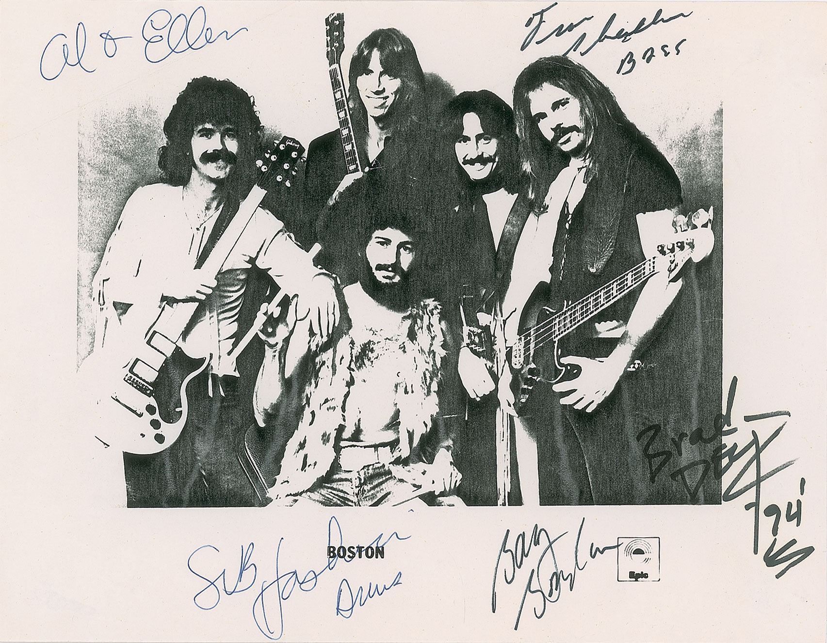 Sib Hashian's paperstock photo of Boston, 11 x 8.5, signed and inscribed in black ballpoint, "Al & Ellen, Sib Hashian, Drums," and in black felt tip, "Brad Delp, 74'," "Fran Sheehan, Bass," and "Barry Goudreau.” In very good to fine condition, with a crease to the upper left.