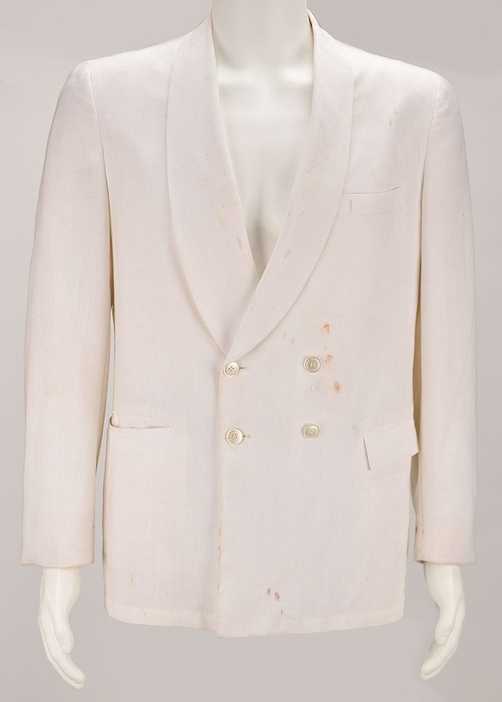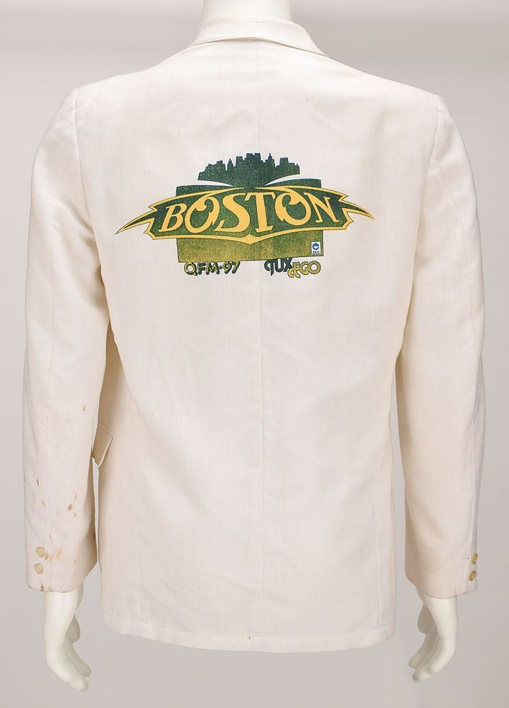 Sib Hashian's personally-owned and -used white Night Magic tuxedo jacket by After Six, size 37 regular, with padded shoulders and shawl lapels and inner right chest pocket bearing a haberdashery stamp from Wolkind Brothers of Buffalo, New York. The back of the jacket is screen-printed with a large green-and-yellow Boston logo as promoted by Epic Records, Tux Ego, and QFM–97 of Buffalo. In very good to fine condition, with scattered staining, most prominently to the flaps and sleeves.