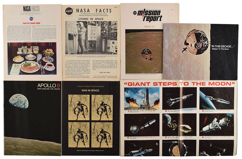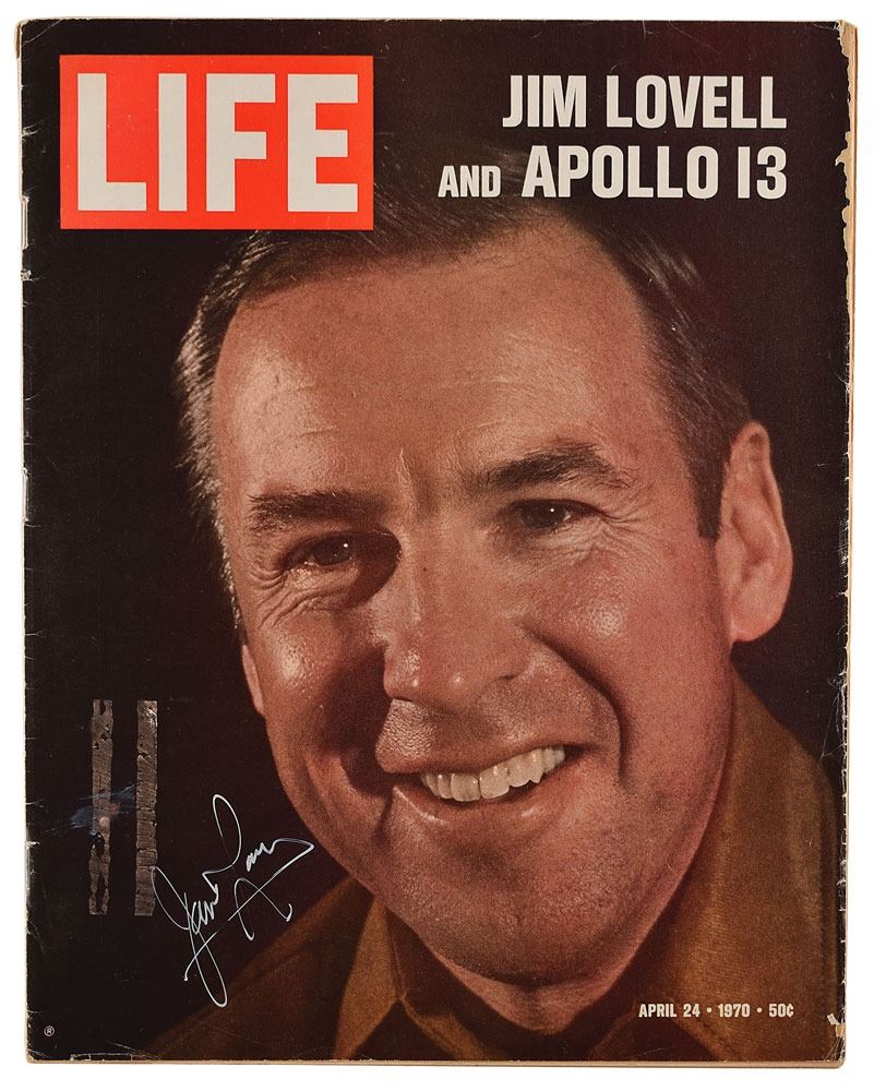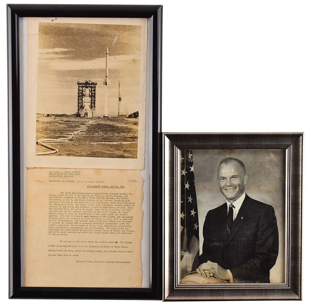 Group lot of 10 NASA-related items from the personal collection of Boston drummer Sib Hashian, including: a 7.75 x 9.75 photo of John Glenn posing with a globe, signed and inscribed in black felt tip, "To Lynn, John Glenn"; an issue of Life magazine from April 24, 1970, signed on the front cover in white ink by James Lovell; an official glossy 8.5 x 11 NASA photo of a Viking rocket rising from its launch platform at White Sands in May 1949, framed with its original caption sheet; a large color poster from a NASA Facts booklet entitled "Journey to the Moon"; a NASA Mission Report booklet for Apollo 10; a pair of NASA Facts booklets from 1969 with headlines "Living in Space" and "Food for Space Flight"; and three NASA booklets entitled "Man in Space," "In This Decade…Mission to the Moon," and "Apollo 8: Man Around the Moon." The Glenn photo is framed to a slightly larger size. In overall very good to fine condition, with Glenn photo permanently affixed to glass due to dampstaining, and wear to edges of Life magazine.