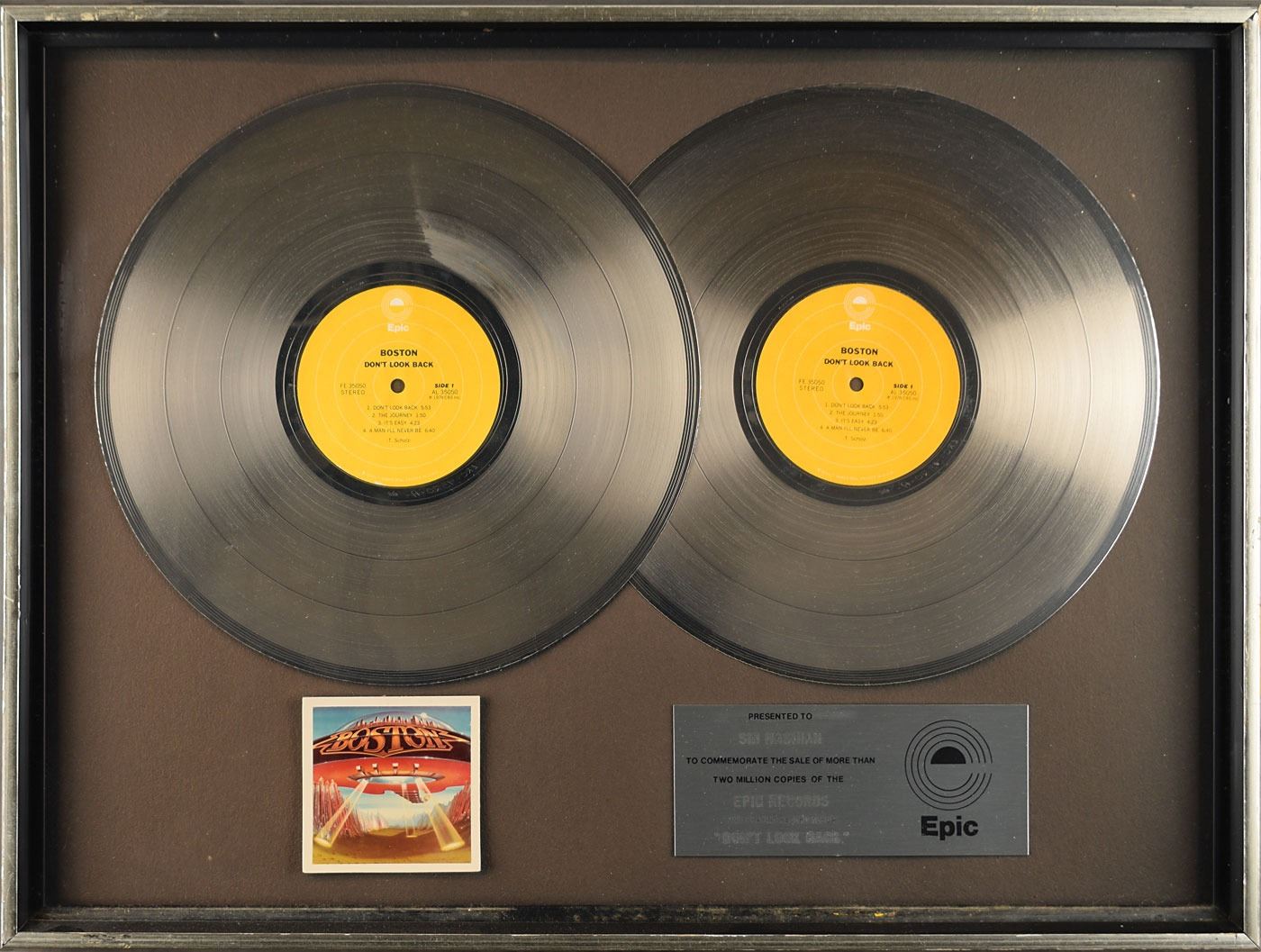 Sib Hashian's official floater-style RIAA multi-platinum sales award presented "to Sib Hashian to commemorate the sale of more than two million copies of the Epic Records long-playing record album 'Don't Look Back.'" Framed with its plate, small image of the album cover, and two discs (each representing one million sales) to an overall size of 29 x 19. The award appears to have been rebacked and is in fine condition. Boston's second studio album, Don't Look Back was released in 1978 and sold over four million copies in the first month of its release, hitting number one on the US charts.