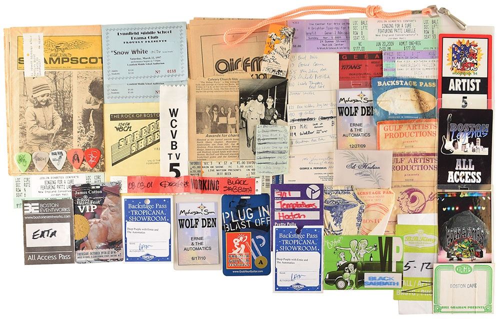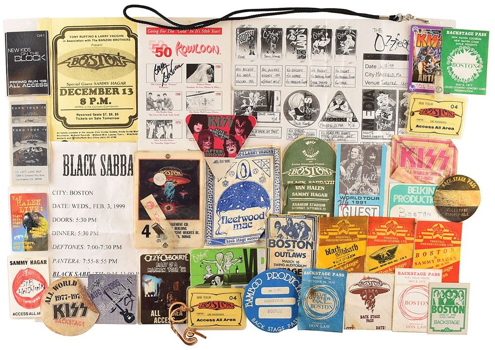 Sib Hashian’s collection of over 70 backstage passes for concerts performed by Boston and other legendary rock groups like KISS, Black Sabbath, Aerosmith, Van Halen, Fleetwood Mac, and more, with concerts dated between 1976 and 2009, including: a backstage pass for a Boston and Blue Oyster Cult show on October 16, 1976; a stage pass for a Boston and the Outlaws concert at the Swing Auditorium in San Bernardino, California on March 18, 1977; a backstage pass for a Boston concert at the RPI Field House on May 8, 1977; a backstage pass for an Aerosmith concert at the Boston Music Hall on March 28, 1978; a pair of all area access passes for Boston’s 1978 Tour marked “Sib Hashian”; a sticker pass for KISS’ 1977–1978 All World Tour; a sticker guest pass for a Boston, Black Sabbath, Van Halen, and Sammy Hagar concert at Anaheim Stadium on September 23, 1978; two passes for Boston’s 1979 European Tour; an all area access pass for Ozzy Osbourne’s 1982 Diary of a Madman Tour; a guest pass for a Hall and Oates concert for their 1991 World Tour; a pass for Van Halen’s 1993 North American Tour, marked on the back, “Sib Hashian”; an after show stick pass for KISS’ 1996-1997 Alive/Worldwide Tour; a VIP sticker pass for the 1999 Ozzfest Tour, stamped “Black Sabbath”; an artist pass for Rocksimus Maximus Tour featuring KISS and Aerosmith for a concert in Boston on November 26, 2003; a laminated all access badge for an Ernie and the Automatics concert on October 10, 2009; a Universal Ozzfest pass marked “Sib Hashian 3,” and many more. In overall very good to fine condition. Also included is a large group of ephemera from Hashian’s personal collection, which includes buttons, guitar picks, handbills, concert tickets, newspaper clippings, a CD mix, a few handwritten notes, and a Kowloon’s 50th Anniversary program signed in black felt tip by Boston guitarist Barry Goudreau.