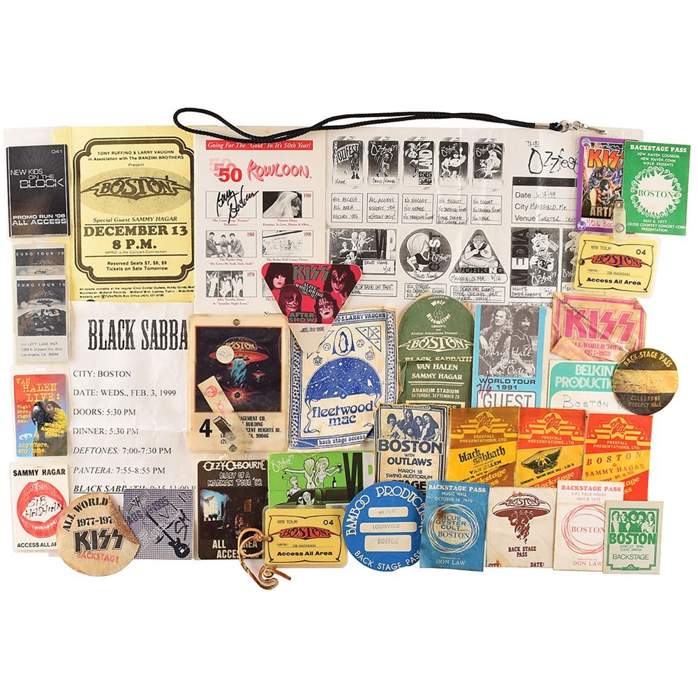 Sib Hashian’s collection of over 70 backstage passes for concerts performed by Boston and other legendary rock groups like KISS, Black Sabbath, Aerosmith, Van Halen, Fleetwood Mac, and more, with concerts dated between 1976 and 2009, including: a backstage pass for a Boston and Blue Oyster Cult show on October 16, 1976; a stage pass for a Boston and the Outlaws concert at the Swing Auditorium in San Bernardino, California on March 18, 1977; a backstage pass for a Boston concert at the RPI Field House on May 8, 1977; a backstage pass for an Aerosmith concert at the Boston Music Hall on March 28, 1978; a pair of all area access passes for Boston’s 1978 Tour marked “Sib Hashian”; a sticker pass for KISS’ 1977–1978 All World Tour; a sticker guest pass for a Boston, Black Sabbath, Van Halen, and Sammy Hagar concert at Anaheim Stadium on September 23, 1978; two passes for Boston’s 1979 European Tour; an all area access pass for Ozzy Osbourne’s 1982 Diary of a Madman Tour; a guest pass for a Hall and Oates concert for their 1991 World Tour; a pass for Van Halen’s 1993 North American Tour, marked on the back, “Sib Hashian”; an after show stick pass for KISS’ 1996-1997 Alive/Worldwide Tour; a VIP sticker pass for the 1999 Ozzfest Tour, stamped “Black Sabbath”; an artist pass for Rocksimus Maximus Tour featuring KISS and Aerosmith for a concert in Boston on November 26, 2003; a laminated all access badge for an Ernie and the Automatics concert on October 10, 2009; a Universal Ozzfest pass marked “Sib Hashian 3,” and many more. In overall very good to fine condition. Also included is a large group of ephemera from Hashian’s personal collection, which includes buttons, guitar picks, handbills, concert tickets, newspaper clippings, a CD mix, a few handwritten notes, and a Kowloon’s 50th Anniversary program signed in black felt tip by Boston guitarist Barry Goudreau.