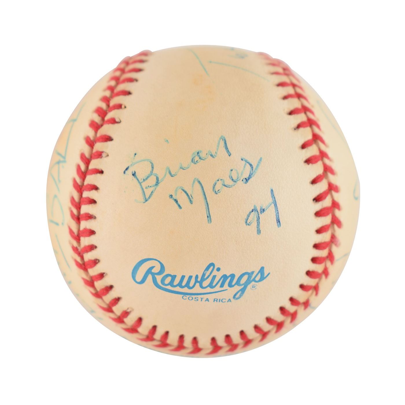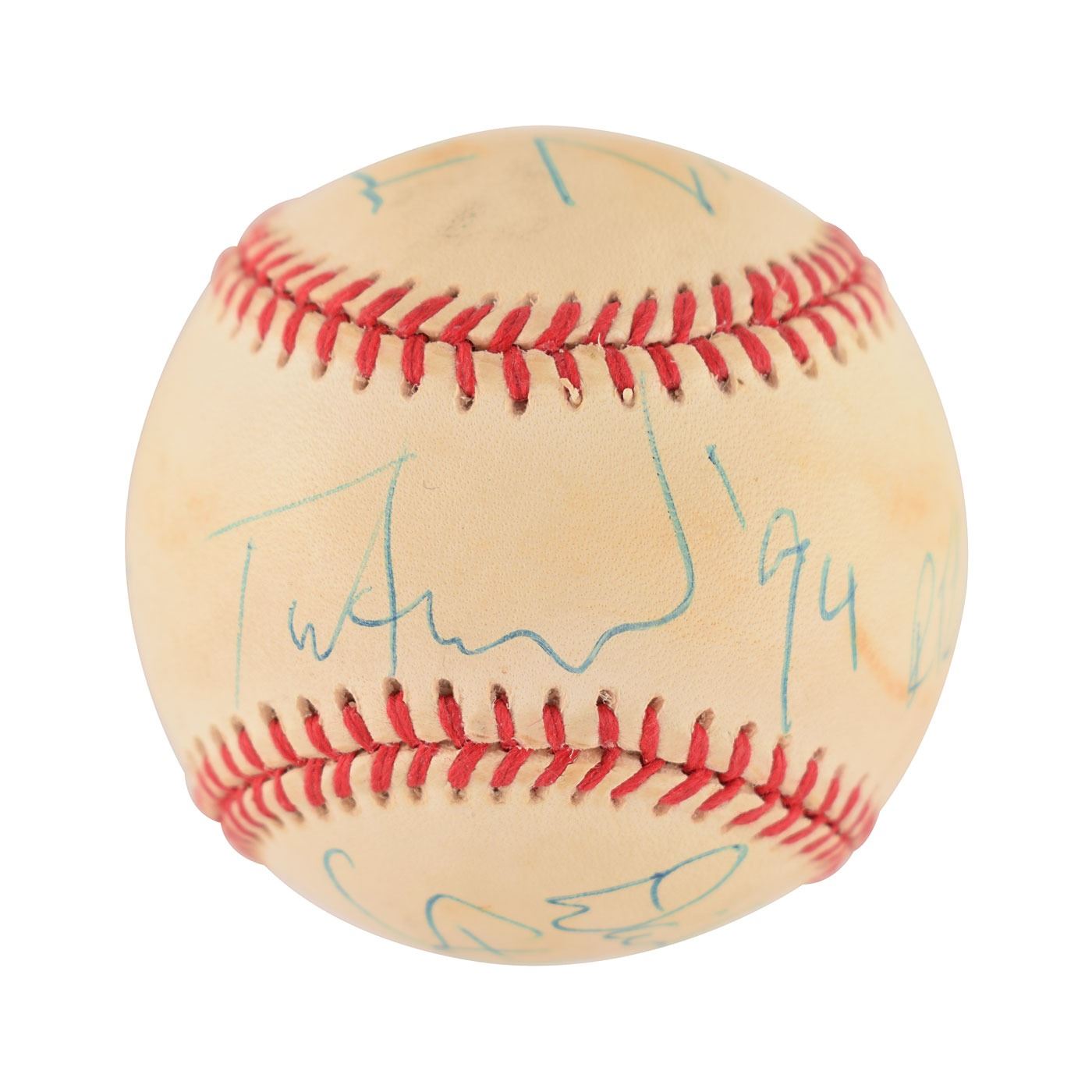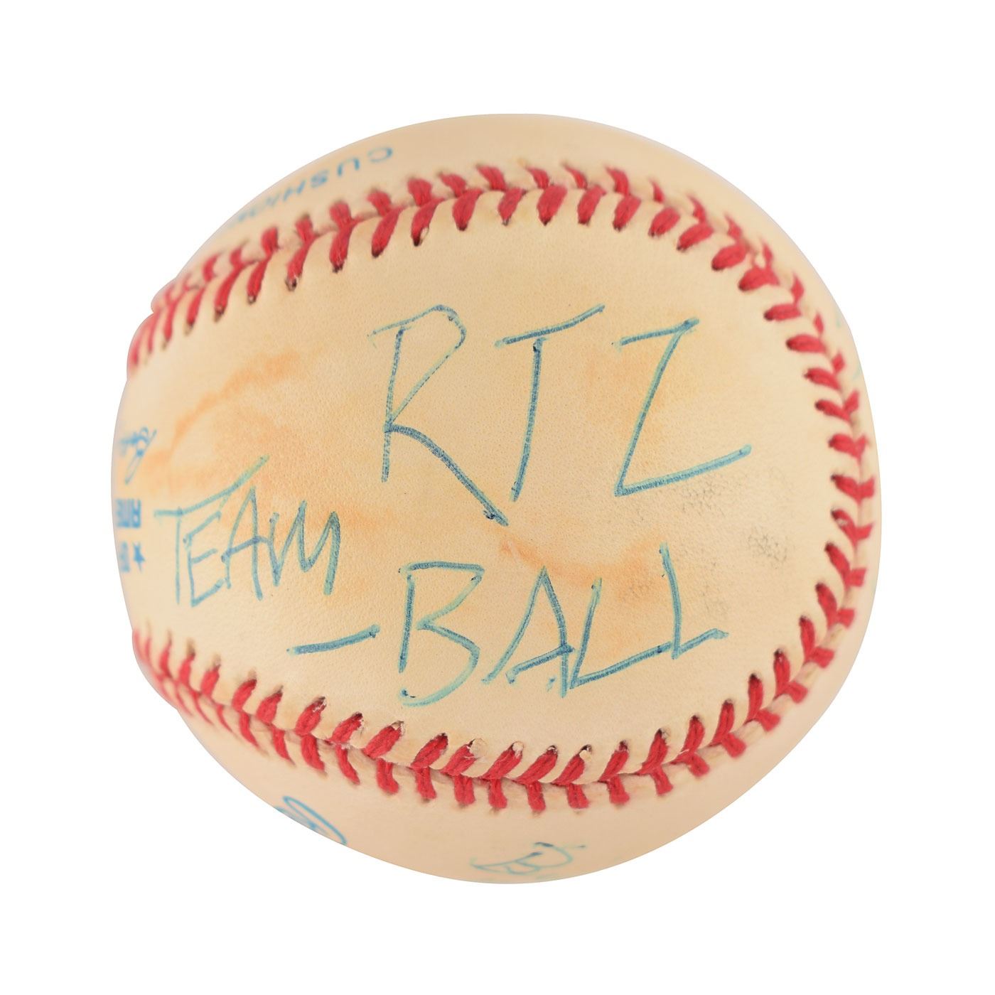 Sib Hashian's official Rawlings American League (Brown) baseball signed in blue ballpoint on the sweet spot and side panels by four members of RTZ, including: Barry Goudreau, Tim Archibald, David Stefanelli, and Brian Maes. One panel is marked: "Team RTZ Ball." In very good to fine condition, with light toning to the panels.