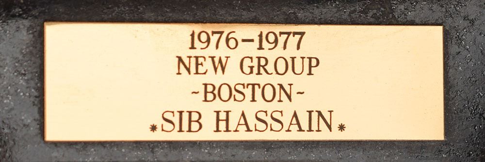 Sib Hashian's Rock Music Award for best new group in 1976–77, with approximate overall dimensions of 9˝ x 3.75˝ x 6.5˝, featuring a medallion at center depicting an angel holding a guitar surrounded by a spoked oval, mounted on a black marble base. The engraved plaque reads: "1976–1977, New Group, -Boston-, Sib Hassain [sic]." In fine condition. Run three times from 1975–1977, the annual Rock Music Awards were inaugurated to recognize rock music that was being overlooked by mainstream awards due to the rise of disco.