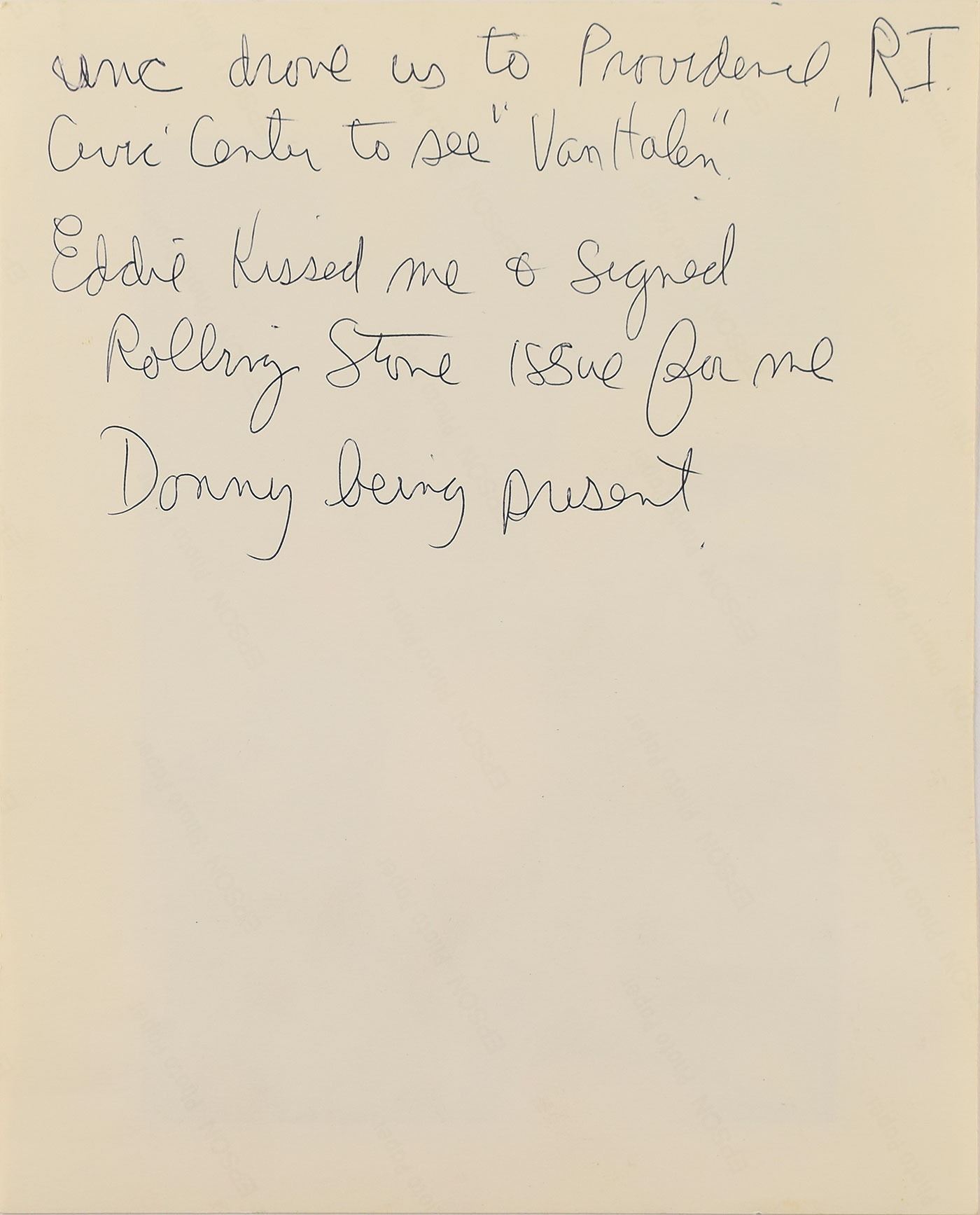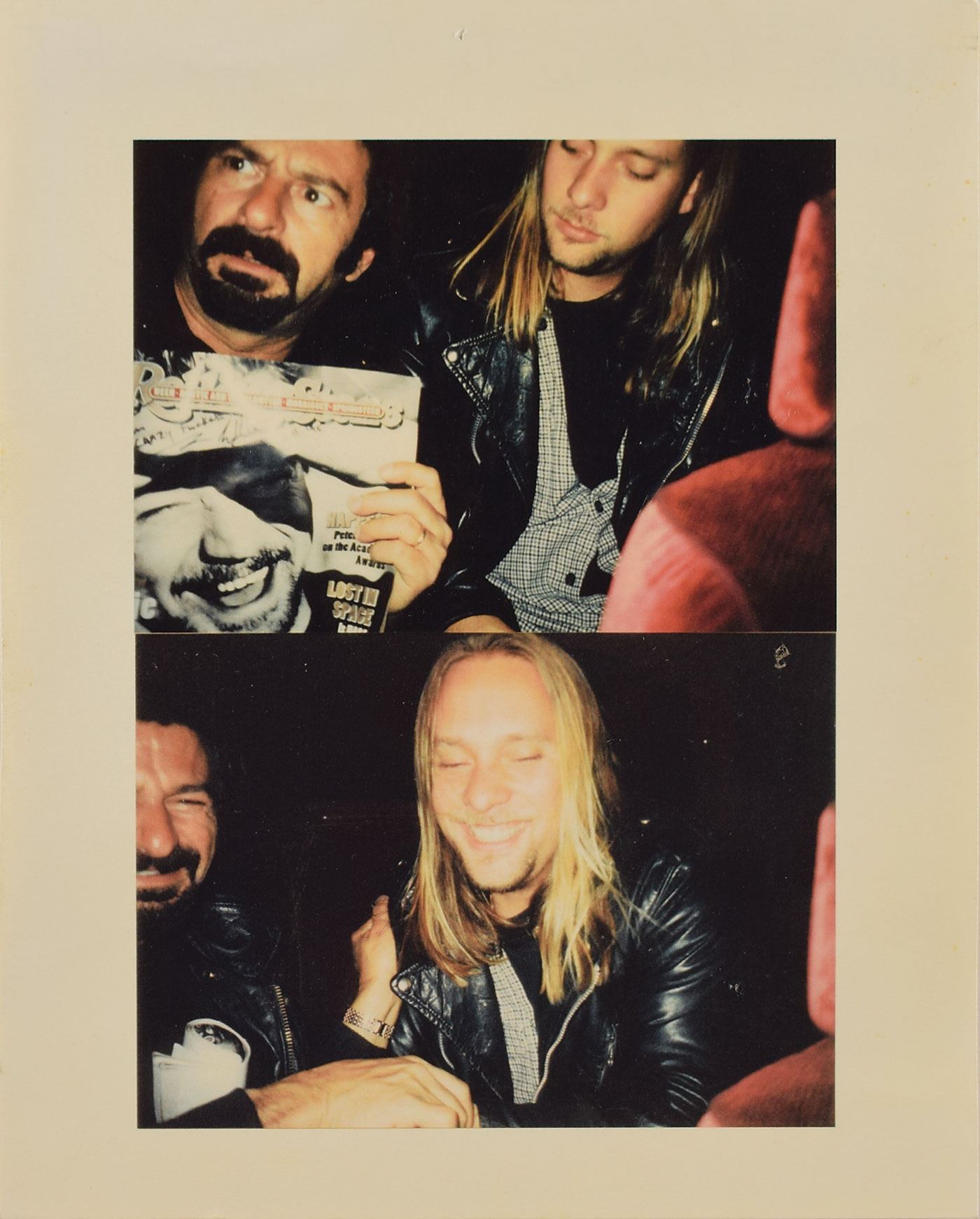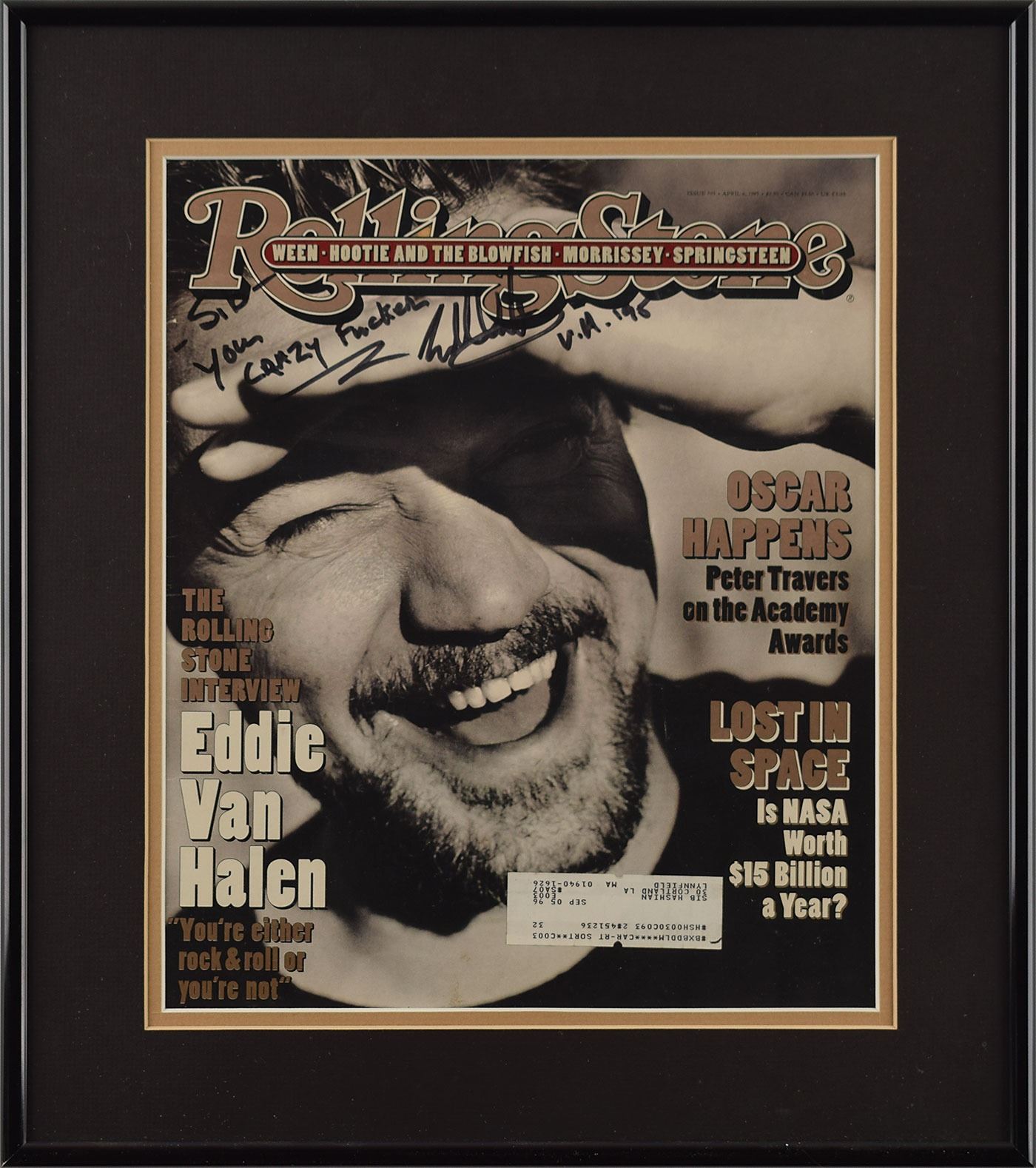 Issue of Rolling Stone magazine from April 6, 1995, 9.75 x 11.75, signed and inscribed in black felt tip to legendary Boston drummer Sib Hashian, "Sib, you crazy fucker, Eddie Van Halen, V.H. '95." The magazine retains Hashian's address label at the bottom. Double-matted and framed to an overall size of 14.25 x 16.25. In fine condition. Accompanied by a photo of Hashian with Van Halen, annotated on the reverse by Hashian: "Unc drove us to Providence, RI Civic Center to see 'Van Halen.' Eddie kissed me & signed Rolling Stone issue for me." A fantastic association piece between two great rockers.